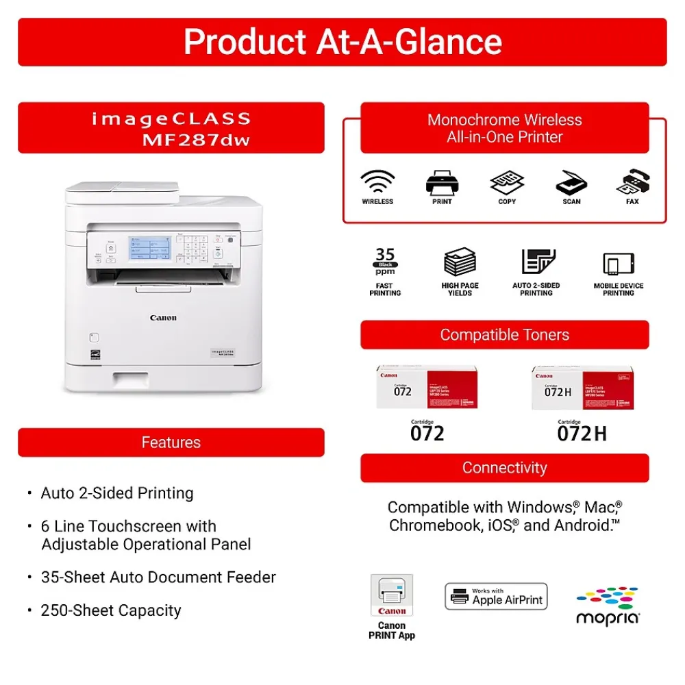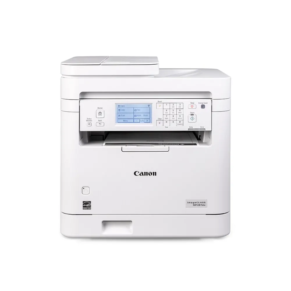 Designed for small office environments, the imageCLASS MF287dw model balances speedy performance and minimal maintenance. The MF287dw is easy to set up and offers media versatility to print on a variety of media types and sizes. Produce crisp, bold documents with fast print speeds of up to 35 pages per minute, using high quality Canon Genuine Toner 072 / 072 H. The MF287dw offers paper capacity of up to 250 sheets in the paper tray and 35-sheet automatic document feeder. The 6-line, adjustable touchscreen delivers an intuitive user experience. Easily connect and print through wirelessly from computers or mobile devices. Print using a variety of mobile apps, including the Canon PRINT app using your compatible mobile device. The MF287dw is also Chromebook compatible, so you can print schoolwork and other documents hassle-free. The MF287dw comes with a 1-year limited warranty and is backed by Canon’s Service and Support network.