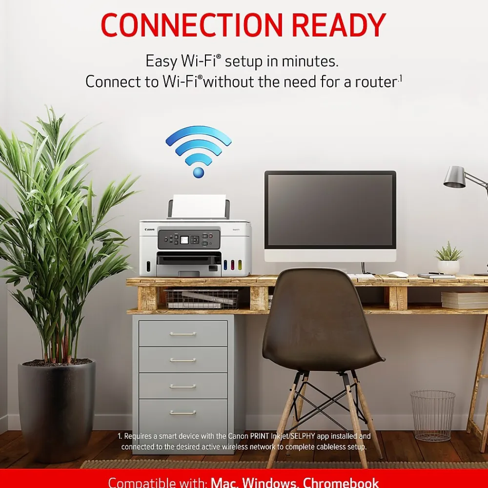 - Package includes: Canon MAXIFY GX3020 wireless all-in-one printer, set-up ink bottles (GI-26: black, cyan, magenta, yellow), documentation, power cord