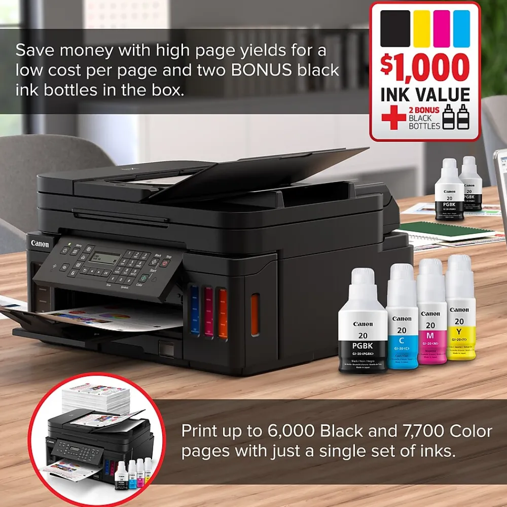 Meet the PIXMA G7020 MegaTank wireless all-in-one printer – designed for serious print productivity with a high page yield of up to 6000 pages of black text or up to 7700 vivid color pages per full ink bottle set from the reliable refillable ink system. The PIXMA G7020 MegaTank printer delivers outstanding high yields resulting in a low cost per page, and also features superior versatility thanks to an ADF for scanning, copying, and faxing. The G7020 allows you to keep working – even on large print jobs – with auto two-sided document printing, fast print speeds, and a combined 350-sheet plain paper capacity.