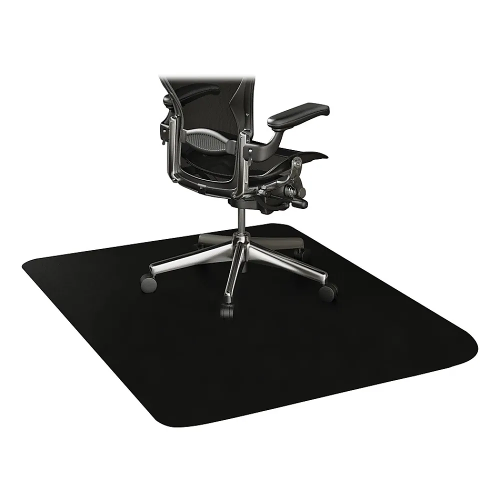 Protect hard floors and cover up current wear with this black resin chair mat for hard floors. GREENGUARD Gold certified for low emissions, this Deflecto Blackmat rectangular resin chair mat for hard floors keeps the office air from added chemicals.