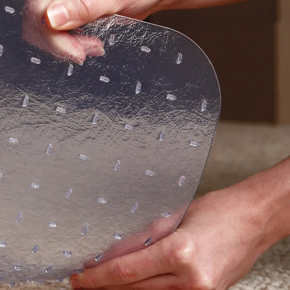 Extend the life of your flat to low pile carpet (up to 1/4″ thick including padding depth) by protecting against chair caster wear and tear. The perfect addition to your workspace, this chair mat provides a smooth surface that enhances ergonomic comfort by allowing your rolling office chair to move freely. Easy to handle, this chair mat features rounded AnchorBar cleats (studs) that hold your mat in place and are gentle on carpets and fingers (no sharp spikes). This chair mat is made with durable vinyl that is GREENGUARD Gold Certified for low chemical emissions to promote a healthier workspace. Designed for use on carpeted surfaces only, do not use on hard floors.
