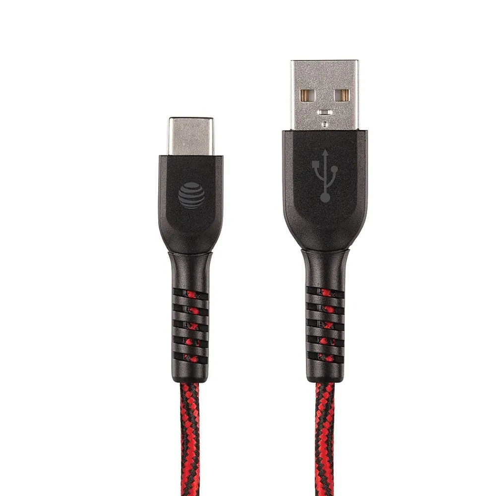 The Red AT&T 10 Ft. Charge and Sync USB to Type-C Cable is ideal for use everywhere. This is a thick, braided, and tangle-resistant cable with a durable design. It provides high speed data transfer.