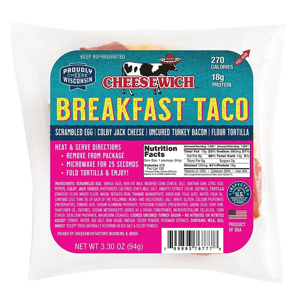 - Scrambled Eggs | Colby Jack Cheese | Uncured Turkey Bacon | Flour Tortilla