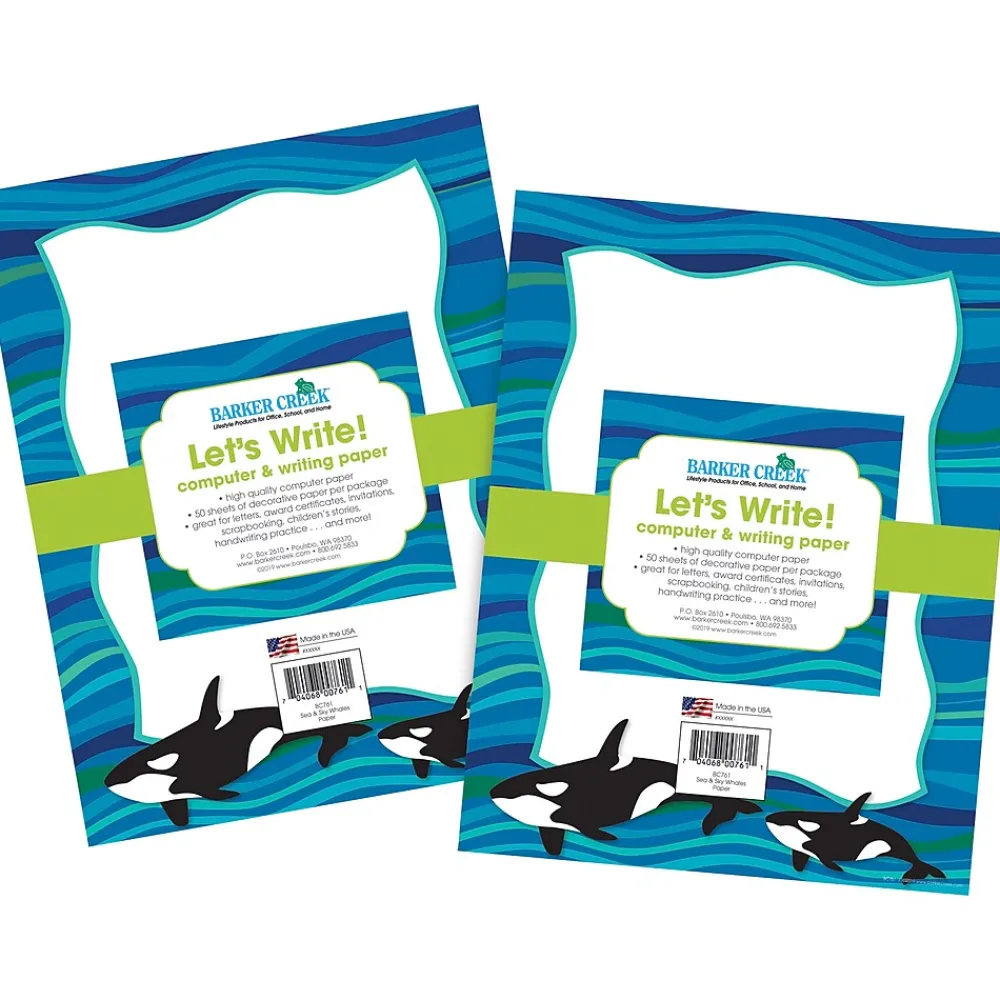 Barker Creek’s Whales Computer Paper is affordable and beautiful. It features a border of beautiful blues and greens with orca whales at the bottom. Use it to add a memorable touch to letters, design custom awards and certificates, add an extra “wow” to presentations and reports, create gorgeous invitations, make stunning bulletin boards, and so much more! Each set includes 100 8 ½” x 11” sheets of decorative paper which is compatible with most laser printers. Coordinating products available: Search Barker Creek Sea & Sky.