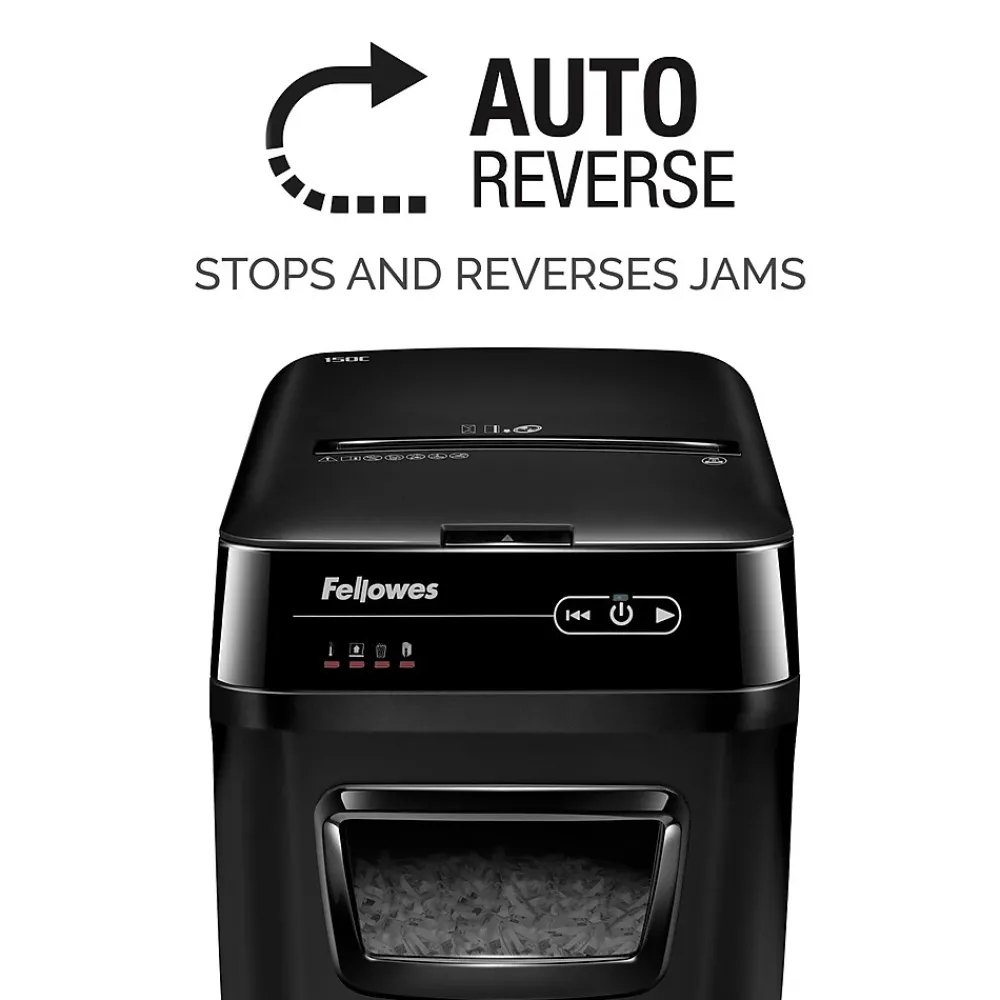 Get the power to automatically handle high-volume document disposal tasks with this AutoMax 150-sheet shredder. Featuring a built-in document feeder and AccuFeed technology, this machine automatically shreds 150 sheets of paper in under two minutes. The powerful motor offers up to 10 minutes of continuous use and lets this machine chew through sensitive materials such as CDs, DVDs and credit cards. This Fellowes AutoMax shredder makes it easy to remove paper jams with an auto reverse function.