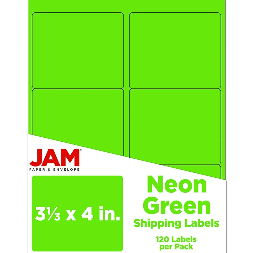JamĀ® 3 1/3″ x 4″ shipping labels in neon green color is constructed from smooth paper and easy to peel/stick. Rectangle label is compatible with printing and a bright/bold way to dress up an envelope, sold as 120 labels with 6 per page.