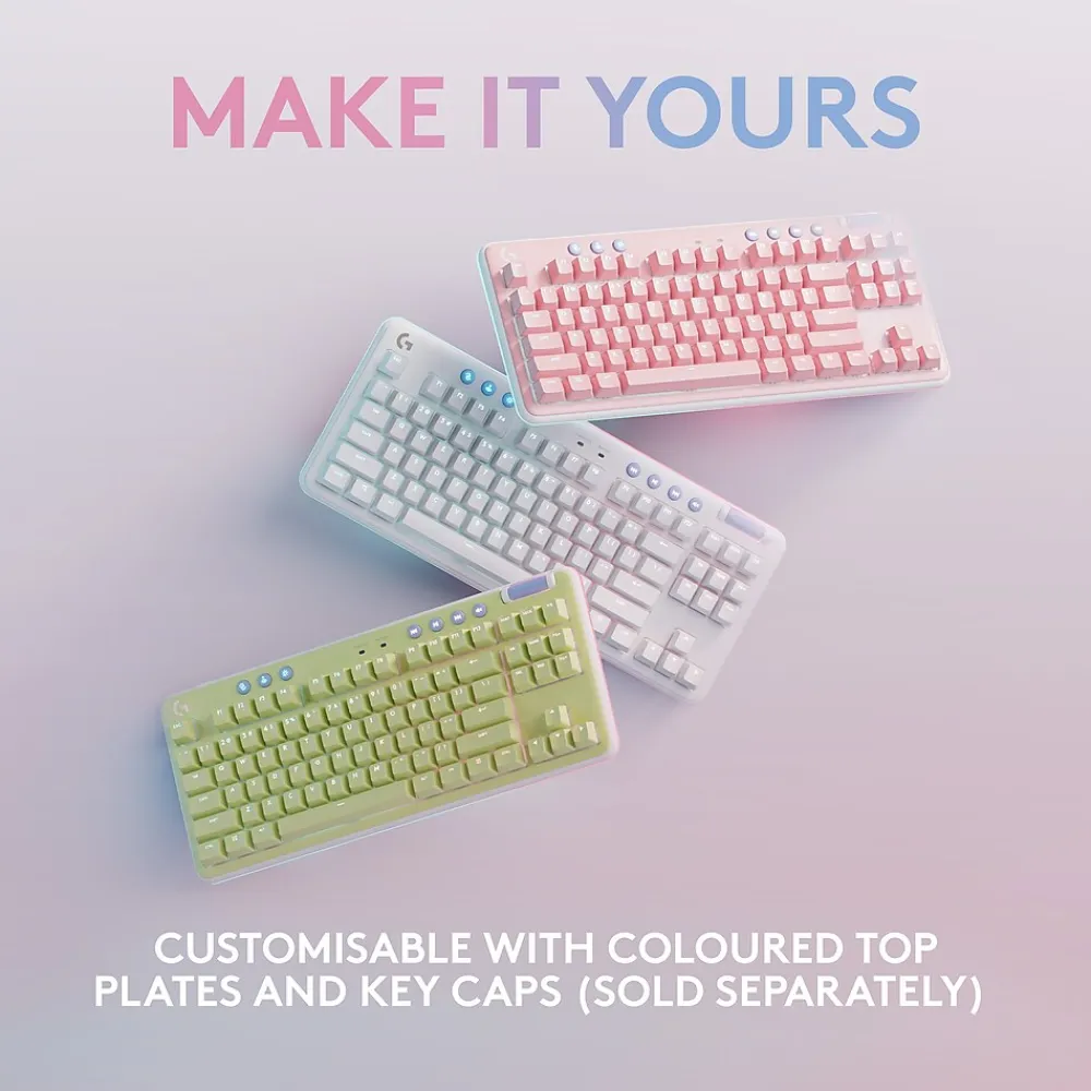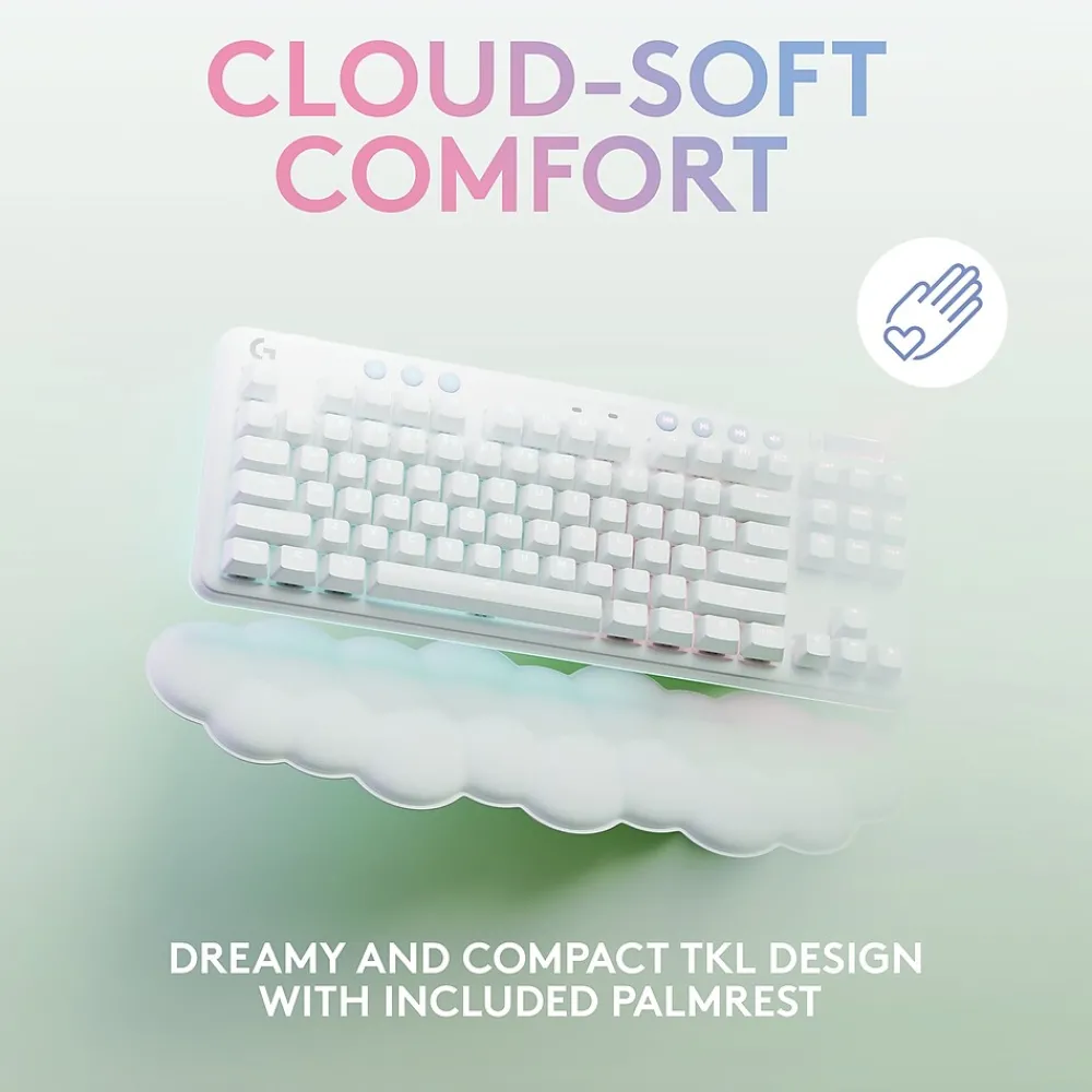 The Aurora G715 wireless gaming keyboard is a compact, comfy keyboard that delivers low-key vibes with high-key performance, so you can express yourself and play your way. Float away with the dreamy white design and cloud-soft palm rest. A compact, tenkeyless layout and adjustable height give that good game feeling, all-day long. Pack up the keyboard, place it anywhere, and play your best with a rechargeable 25-hour battery life and LIGHTSPEED wireless or Bluetooth connectivity. Show off your playstyle with ethereal LIGHTSYNC RGB on the keyboard perimeter and under the keys, along with out-of-the-box Aurora collection signature lighting.