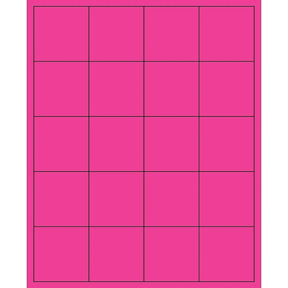 2″ x 2″ Fluorescent Pink Rectangle Laser Labels. Use to create your own product or mailing labels. Labels work with both Laser and ink jet printers. Permanent adhesive. Labels stick to a variety of smooth surfaces including paper, corrugated, plastic, wood, glass and metal.