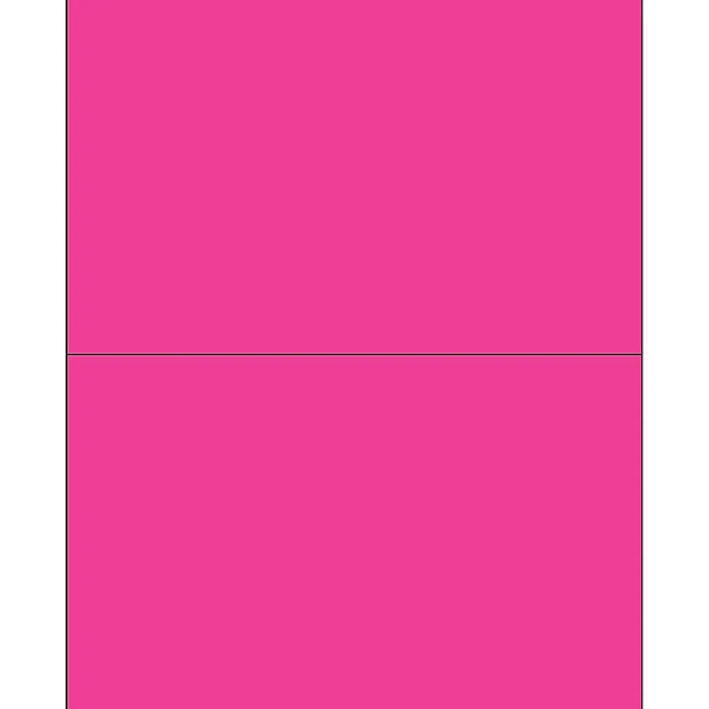 8 1/2″ x 5 1/2″ Fluorescent Pink Rectangle Laser Labels. Use to create your own product or mailing labels. Labels work with both Laser and ink jet printers. Permanent adhesive. Labels stick to a variety of smooth surfaces including paper, corrugated, plastic, wood, glass and metal.
