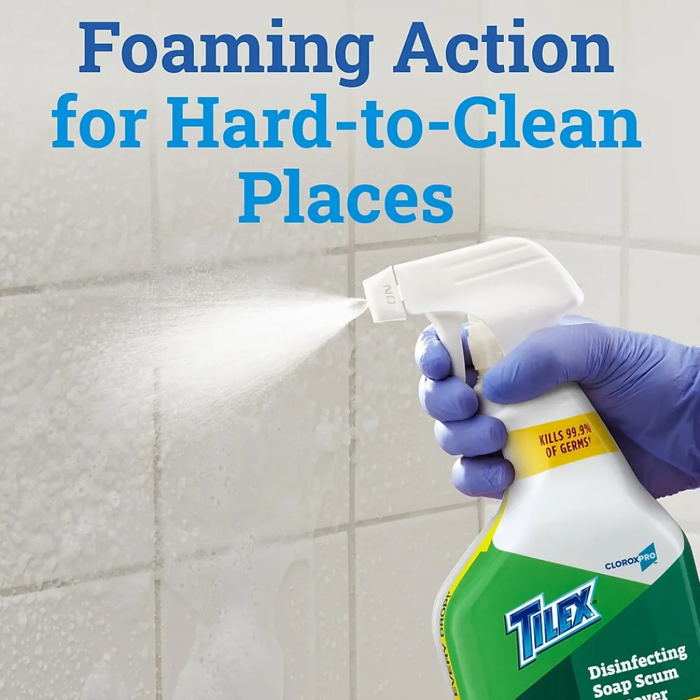 The powerful formula of CloroxPro Tilex Disinfecting Soap Scum Remover cleans soap scum before your eyes. Its penetrating foam cleans, disinfects and deodorizes many surfaces including glazed ceramic tile, fiberglass, shower doors, toilets and sinks. It also kills 99.9% of viruses* and bacteria, including the COVID-19 Virus*. This spray cleaner is ideal for offices, day care centers, restaurants, hotels and other commercial facilities. Spray every drop with Smart Tube technology that reaches to the very bottom of the bottle. CloroxPro, where clean means everything. Packaging may vary. Staphylococcus aureus, Salmonella enterica, Influenza A virus, Respiratory Syncytial Virus (RSV), Rhinovirus Type 37. Kills SARS-CoV-2 on hard, nonporous surfaces.