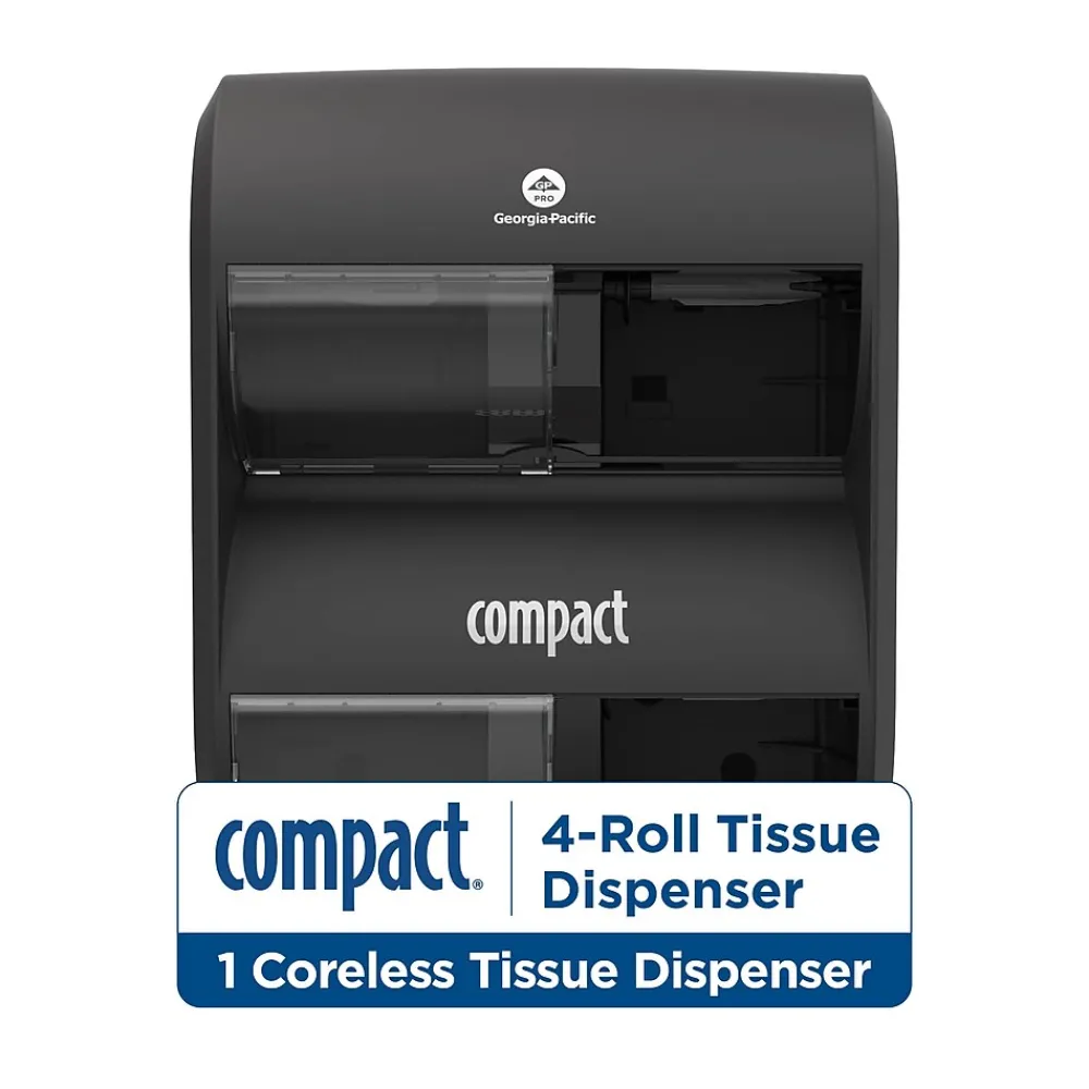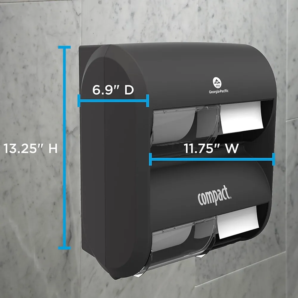 The Compact Quad® Plus Toilet Paper Dispenser was designed for maximum wastereduction, ease of maintenance, and hygiene. It is a coreless toilet paper dispensingsystem that holds up to 6,000 2-ply or 12,000 1-ply sheets. The Compact Quad (R)Plus Dispenser features a patented roll lock mechanism to help ensure maintainers donot replace rolls prematurely or have to fumble with sleds. When combined with theroll lock mechanism, our coreless toilet paper rolls enable nearly 100% paper usage.When the dispenser is opened, the empty roll holders automatically drop down,allowing for the efficient replacement of rolls that are completely empty. Additionally,the push functionality of the lock makes it easy to access and use the dispenser key.GP PRO is a division of Georgia-Pacific Consumer Products. We deliver well-designed,durable and easy-to-maintain professional solutions to meet the handwashing andcleaning needs for a range of business applications.