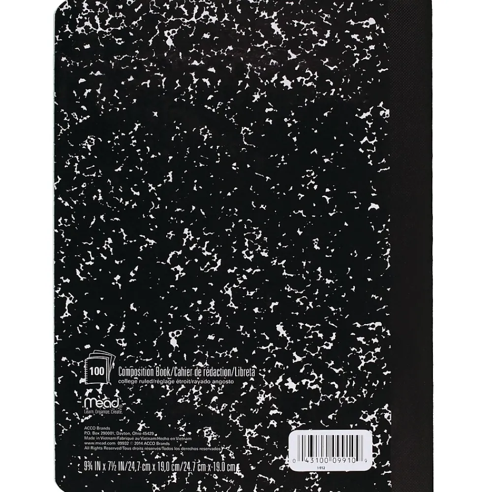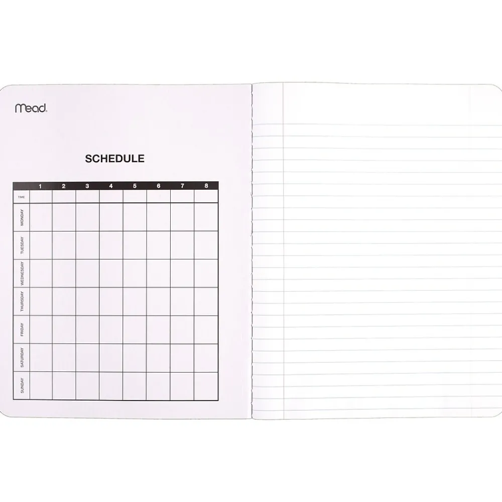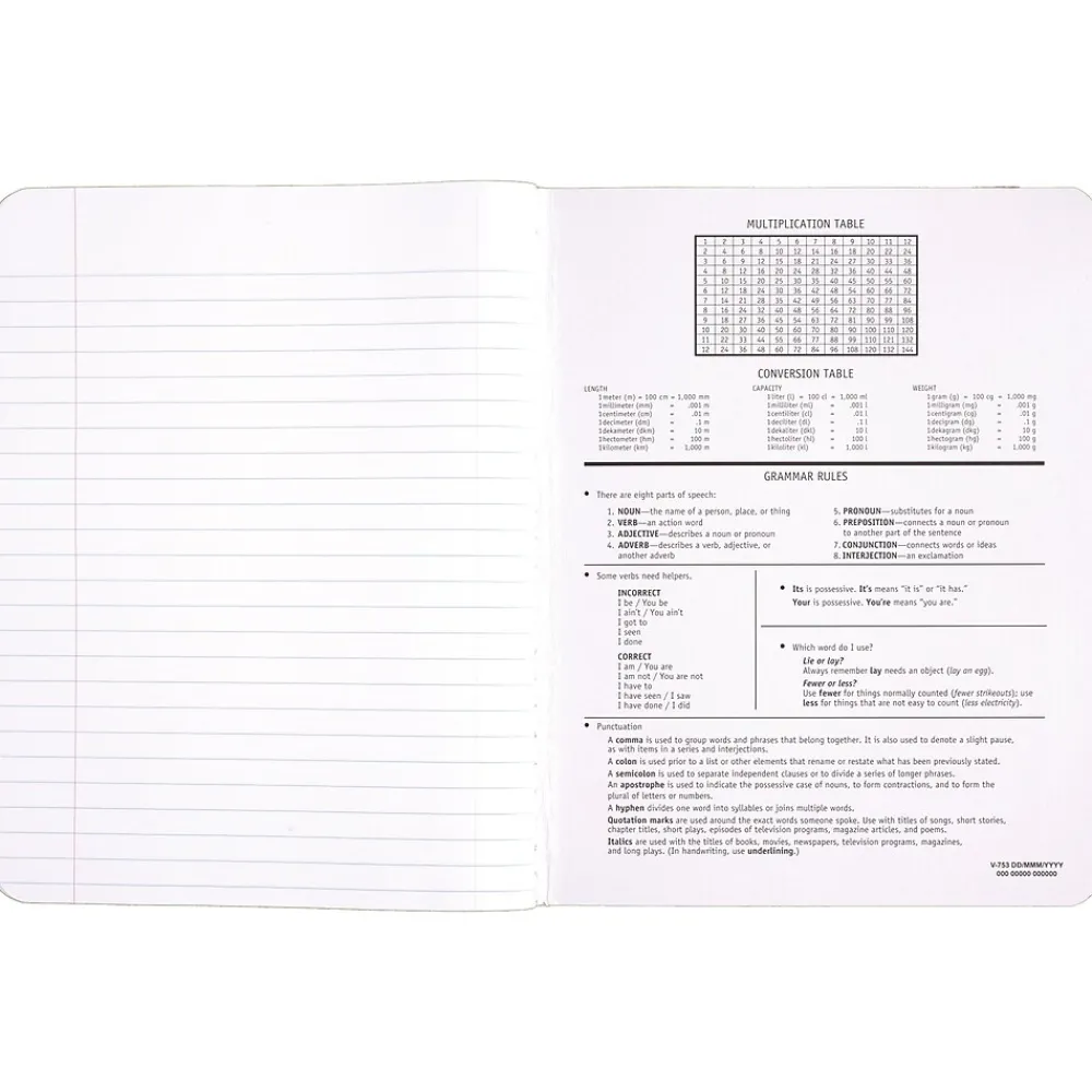 Keep notes handy with this one-subject composition notebook. Featuring a wide-ruled format, this notebook offers ample room for creative writing, sketches and other notes, while the included class schedule on the inside front cover provides convenient scheduling. This Mead Five Star marble composition notebook has multiplication tables, grammar rules and a conversion table on the interior back cover, so you can reference them easily.