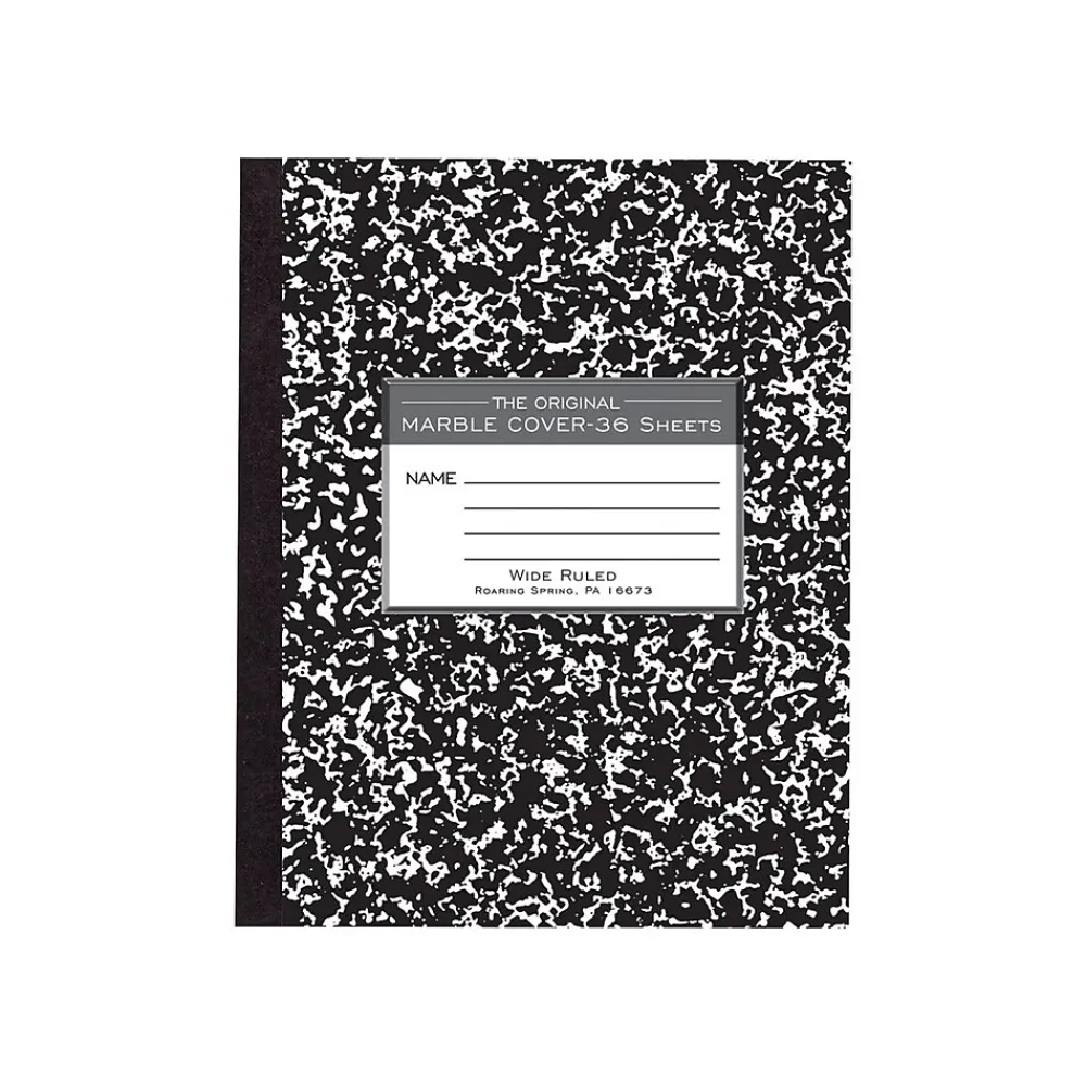 Record your notes in this black marble composition book. The flexible cover makes it easy to store this composition book in a backpack, while the sturdy backing provides a solid writing surface. This Roaring Spring Paper Products composition book has 36 sheets of 15 lb. paper and features a center-sewn, tape bound construction, so you don’t have to keep track of loose pages.