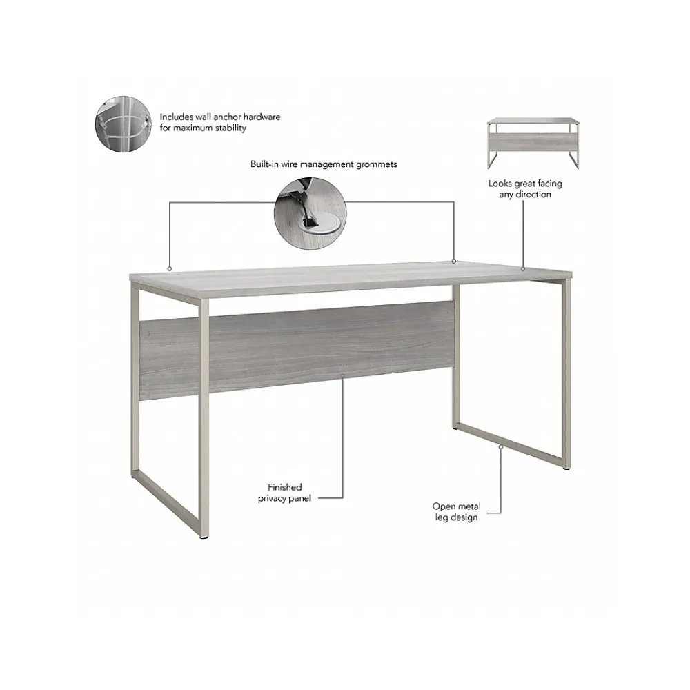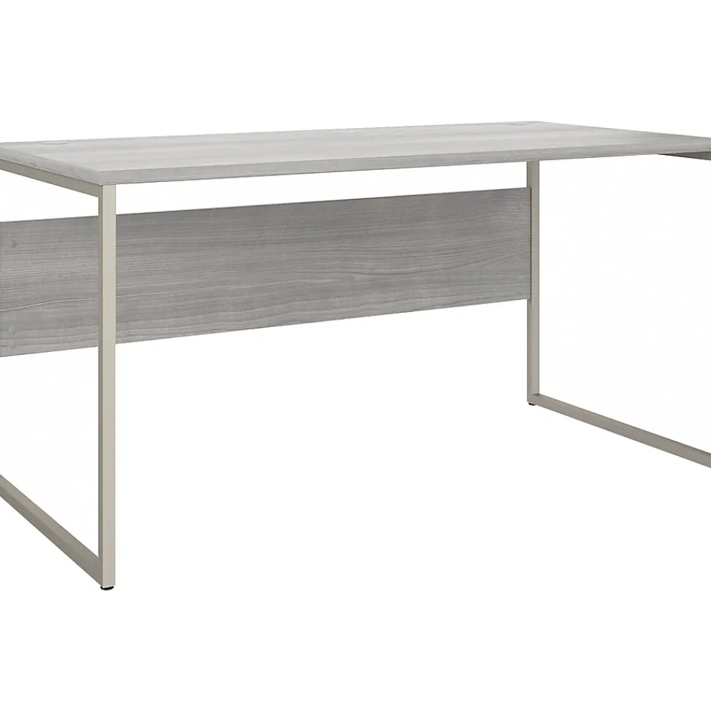 The Bush Business Furniture Hybrid 60″W x 30″D computer table desk blends a durable work surface with sturdy metal legs to offer a stylish, long-lasting solution for the modern professional. Tackle your next project or assignment with a computer, books, paperwork, and more on a desktop that supports up to 200 lbs. Two built-in wire management grommets keep cords and cables in order, so your work area remains free from unnecessary clutter. The computer desk’s open leg design and finished privacy panel allow it to look great facing any direction in a home or professional office environment. Find the perfect look for your space with five contemporary finish options: black walnut, modern hickory, platinum gray, storm gray, and white. This modern desk has been meticulously tested to meet or exceed ANSI/BIFMA quality standards for safety, durability, and performance and is backed by the Bush Business Furniture 10-year manufacturer warranty. See the full Hybrid collection for coordinating items to enhance your workspace as needed, including file cabinets, bookcases, and storage cabinets (coordinating items sold separately). American-made with US and imported parts.