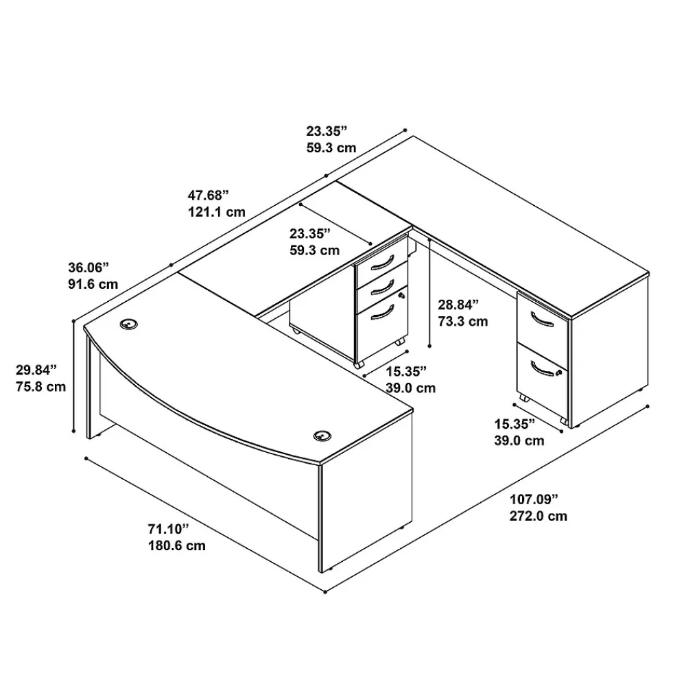 Sophisticated and spacious, this Bush Business Furniture Westfield U Shaped Desk brings commercial-quality features and durability to the workplace. The expansive wraparound U Shaped Desk includes all the room a busy professional needs to spread out for years of productivity. An inviting Bow Front design offers an extended surface for guests to pull up chairs and collaborate, while integrated wire management controls your electronics cables for a tidy workspace. The thermally fused laminate surface and sturdy construction combine with Brushed Nickel hardware and extended modesty panels for a lasting professional appearance you’ll love. The Mobile File Cabinets lock for your security and feature 3 full-extension file drawers and 2 box drawers combined. Westfield offers endless layout options and 7 finishes. Backed by a 10 Year Warranty. American made with U.S. and imported parts.