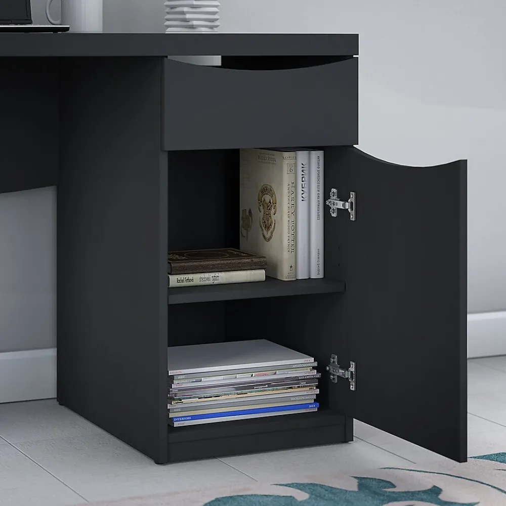 With an attractive, contemporary design, the Bush Furniture Montrese Computer Desk fits in small spaces but offers total functionality. Let the modern styling blend seamlessly into your home office, bedroom, dorm or living room. The compact design and finished back provide placement flexibility – so put the small desk in a tight space or the middle of a room. The stylish but sturdy desk comes with reliable features, allowing Montrese to work in a home office or small business. Spread out with your laptop, pay bills, surf the net or finish homework on the durable surface. Store office supplies in the smooth box drawer, which glides on ball bearing slides for easy access to contents. Hide larger items from sight in the closed storage cabinet with an adjustable shelf and smooth, self-closing European-style hinges. Durable edge banding helps prevent nicks. Backed by a 1 Year Warranty.
