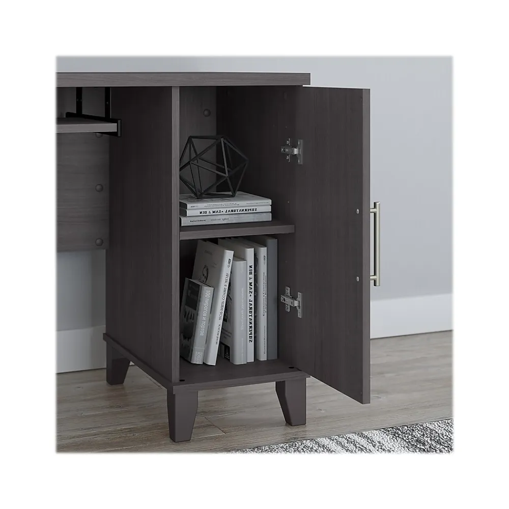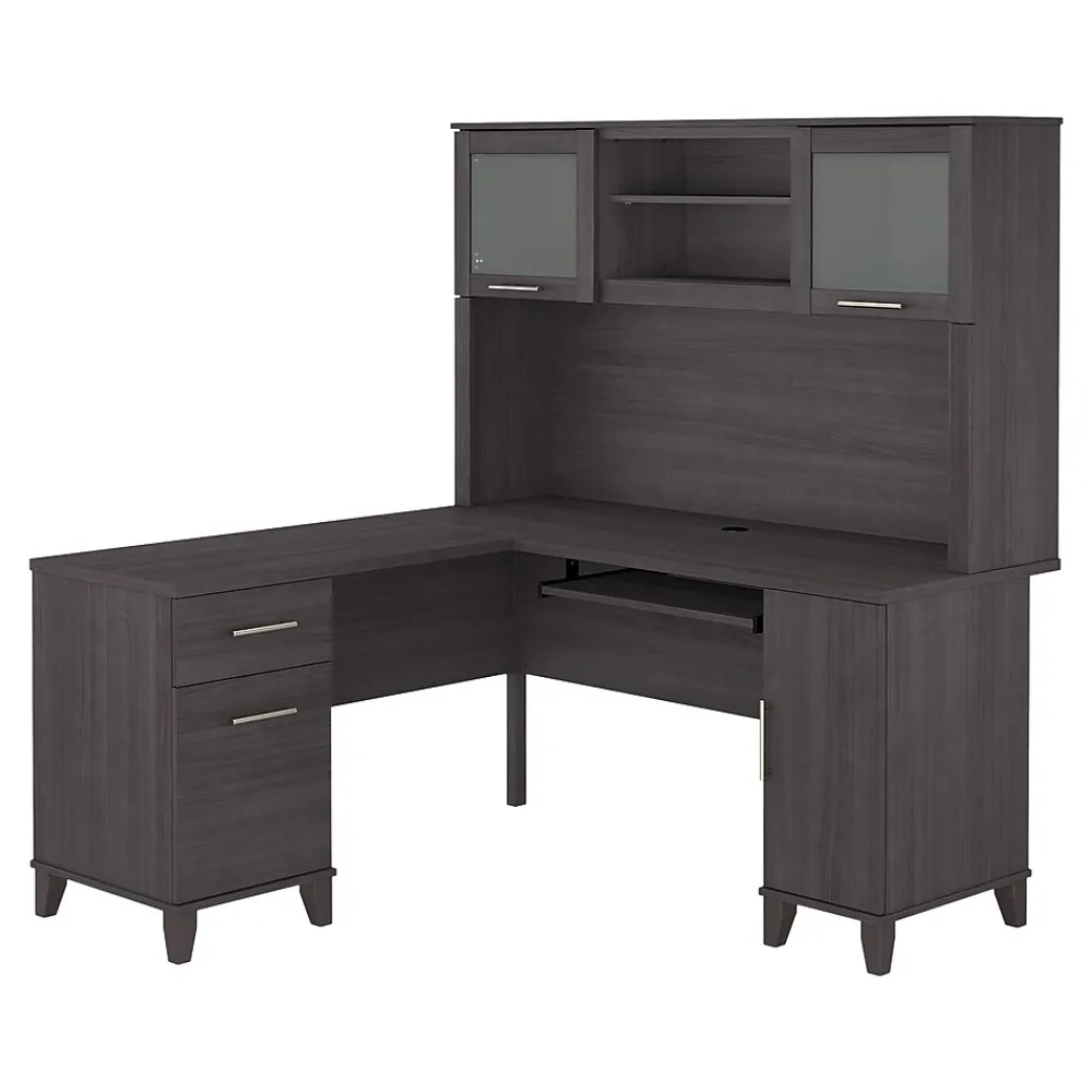 The transitional Bush Furniture Somerset 60″W L-shaped desk with hutch offers a stylish and practical workspace solution for the home or small office. Maximize the potential of your home office with this furniture set. Create your remote work headquarters with space for a computer, phone, printer, and more. A convenient pull-out tray provides a perfect place to keep a keyboard or laptop, while a storage cabinet and box drawer offer plenty of storage for supplies. A file drawer with ball bearing slides allows for easy access to letter-size documents. A wire management grommet helps keep cords and cables in order. The hutch features open storage with a large compartment for books or decorations, an adjustable shelf to hold work in progress, and two frosted glass doors that provide concealed storage. This home office furniture set is tested to meet ANSI/SOHO standards for safety and performance and is backed by the Bush Furniture 6-year manufacturer warranty. American-made with US and imported parts.