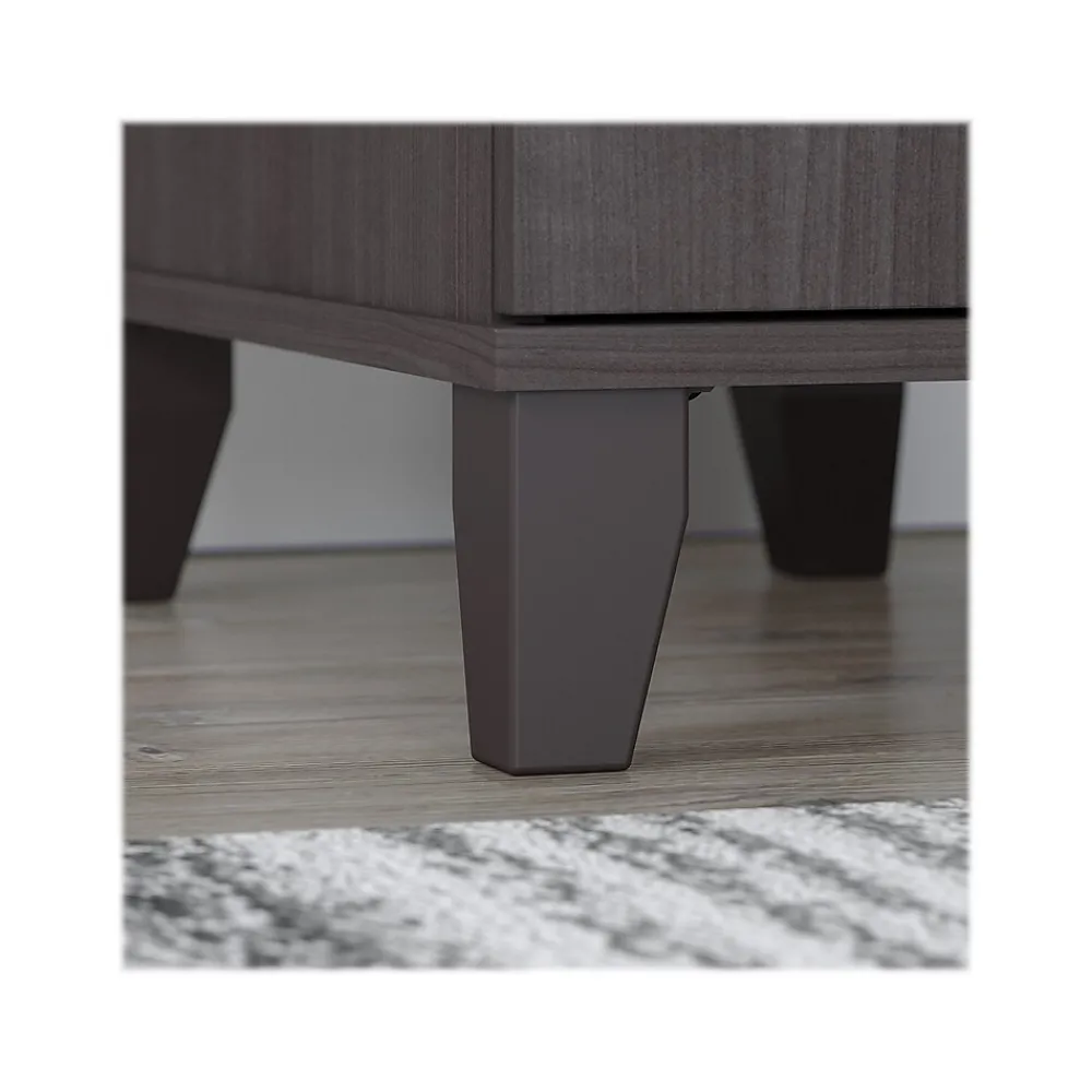 The transitional Bush Furniture Somerset 71″ office desk with hutch offers a stylish and practical workspace solution for the home or small office. A spacious work surface and plenty of storage capacity make this desk with drawers and hutch a perfect choice for your home office. Spread out with a computer and paperwork while multitasking on an expansive desktop that includes a wire management grommet to keep cords and cables in order. The desk’s file drawer opens on smooth full-extension ball bearing slides for easy access to legal- and letter-size documents, while a box drawer keeps the office supplies and utensils you need close by. The hutch attaches to the desktop and adds a pair of frosted glass doors for concealed storage in addition to open cubby spaces with two shelves for books, decorations, and more. This home office desk with drawers and hutch set is tested to meet ANSI/SOHO quality standards for safety and performance and is backed by the Bush Furniture 6-year manufacturer warranty.