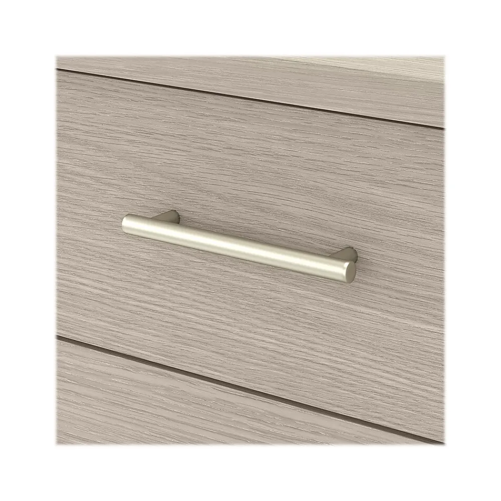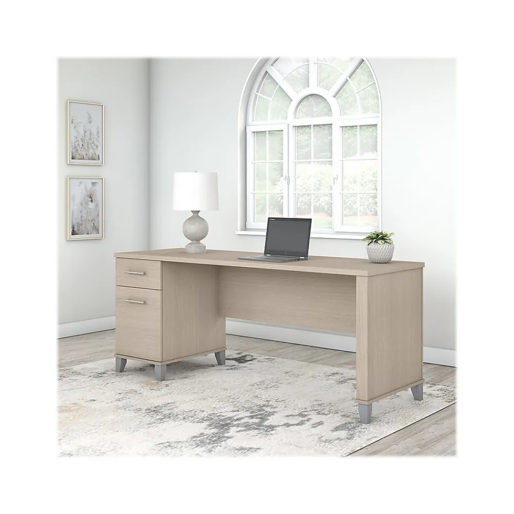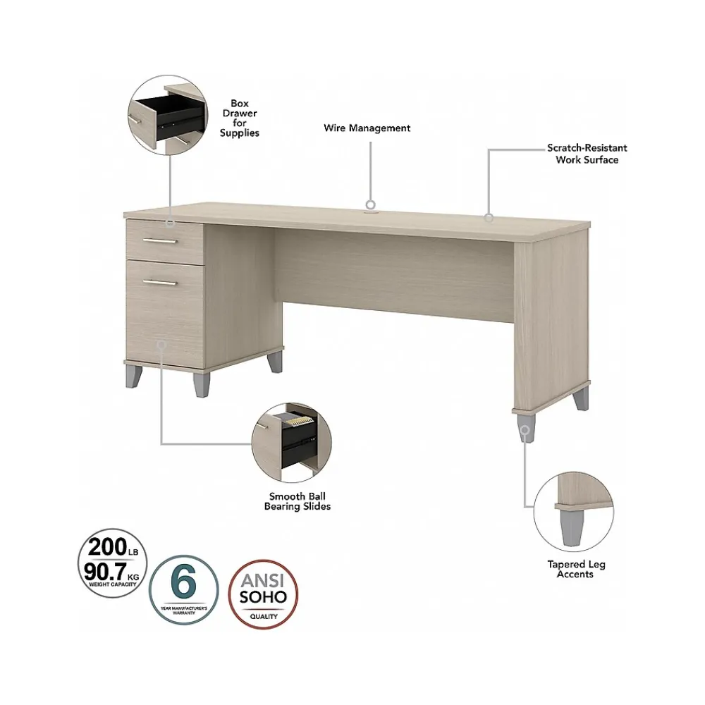 An expansive work surface and built-in storage make the Bush Furniture Somerset 72″W computer desk with drawers a perfect choice for your home office. The spacious desktop offers plenty of room to spread out with a computer and paperwork and includes a wire management grommet to keep cords and cables secure and out of sight. The desk’s file drawer opens on full-extension ball bearing slides for easy access to legal- and letter-size documents, while a box drawer keeps the office supplies and utensils you need close by. A finished back side allows the desk to look great no matter where it’s positioned in the room. The computer desk can also be used with the Somerset 42″W three-position sit to stand return (sold separately) to create an ergonomic height-adjustable workspace. The desk with drawers meets or exceeds ANSI/SOHO standards for safety and performance and is backed by a 6-year manufacturer limited warranty.