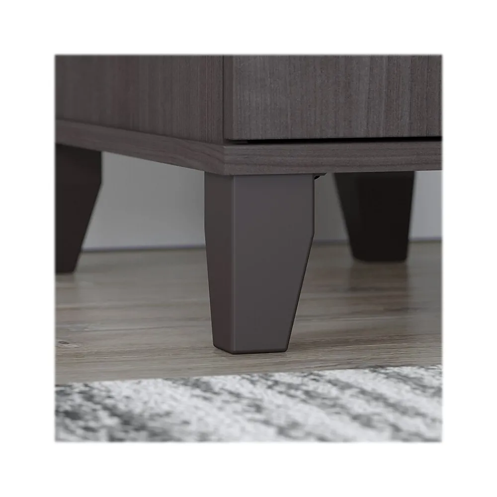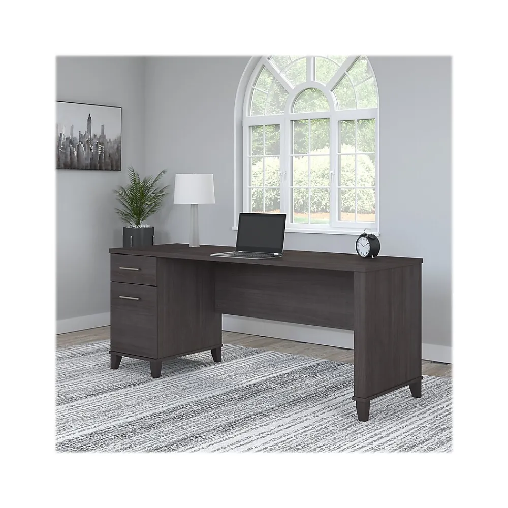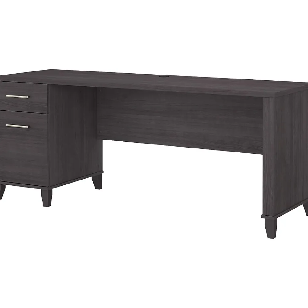 An expansive work surface and built-in storage make the Bush Furniture Somerset office desk with drawers a perfect choice for your home office. The spacious desktop offers plenty of room to spread out with a computer and paperwork and includes a wire management grommet to keep cords and cables secure and out of sight. The desk’s file drawer opens on full-extension ball bearing slides for easy access to legal- and letter-size documents, while a box drawer keeps the office supplies and utensils you need close by. A finished back side allows the desk to look great no matter where it’s positioned in the room. The office desk with drawers meets or exceeds ANSI/SOHO standards for safety and performance and is backed by a 6-year manufacturer limited warranty.