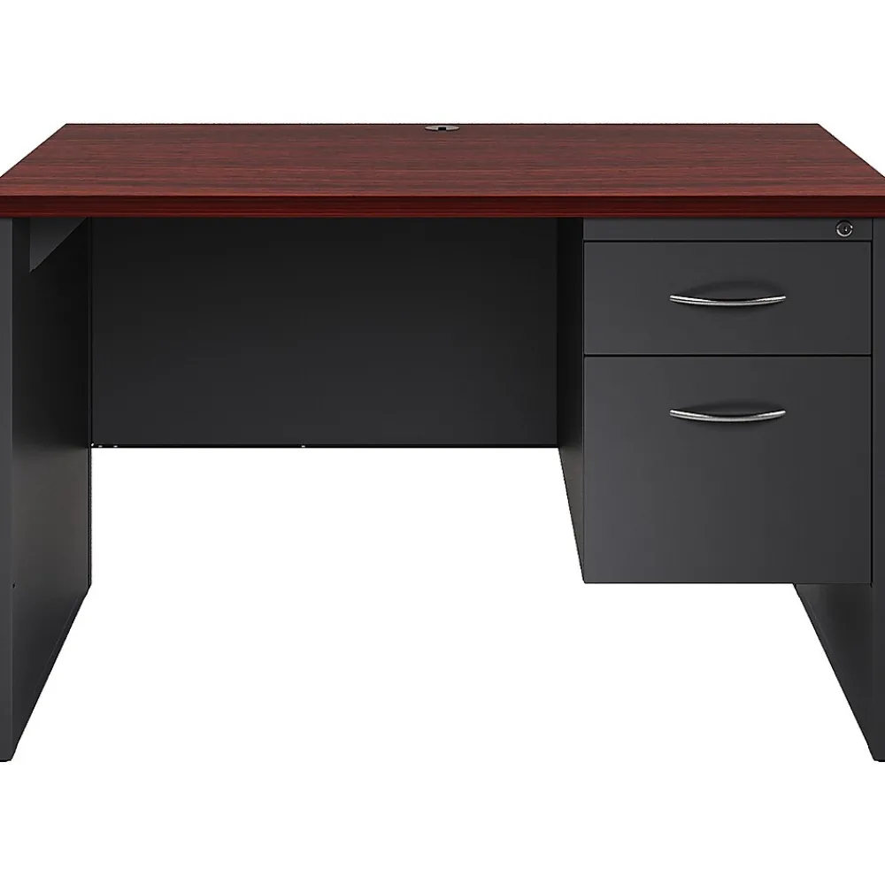 Modular single pedestal desk. Includes a core removable lock. Box and file drawers feature full extension slides and premium satin nickel Arch pull handles. Precision ball-bearing suspension. Durable laminate work surface with grommet holes for cord management. Radiuses profile edge banding for enhanced comfort. Full height end panels with leveling glides. One pencil tray standard per desk and one drawer divider standard per box drawer. Meets or exceeds ANSI-BIFMA standards and contains up to 28 percent recycled material. This desk is a part of our Executive Modular Desk Collection.