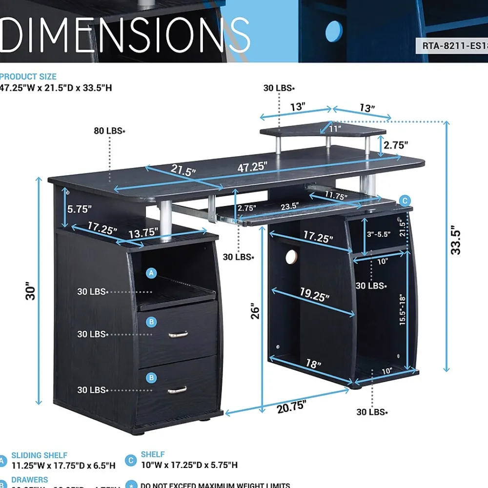 - Includes an elevated accessory shelf, two convenient shelves underneath top, two standard shelves for documents and accessories, and an open CPU compartment