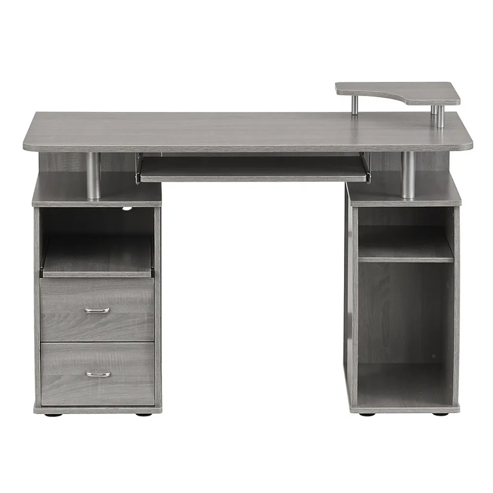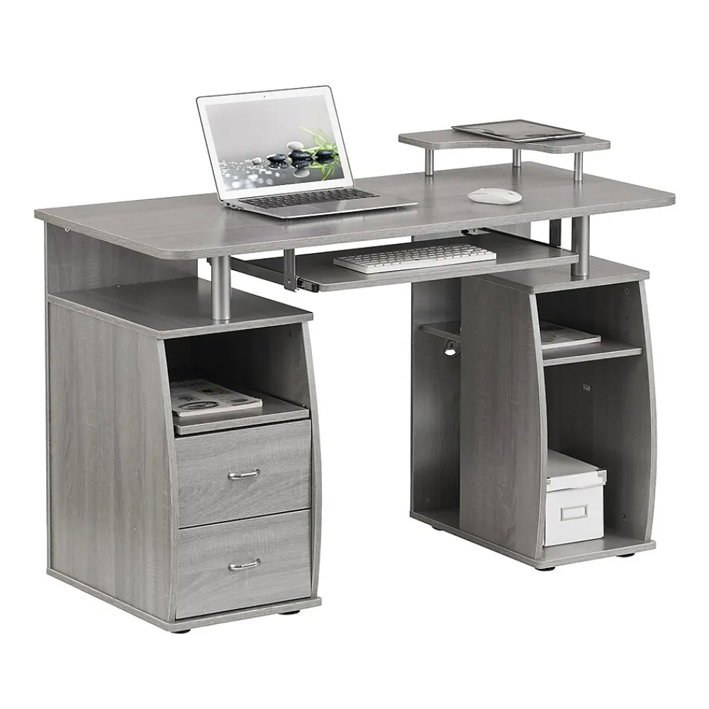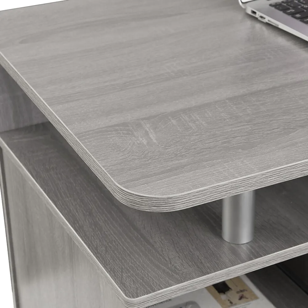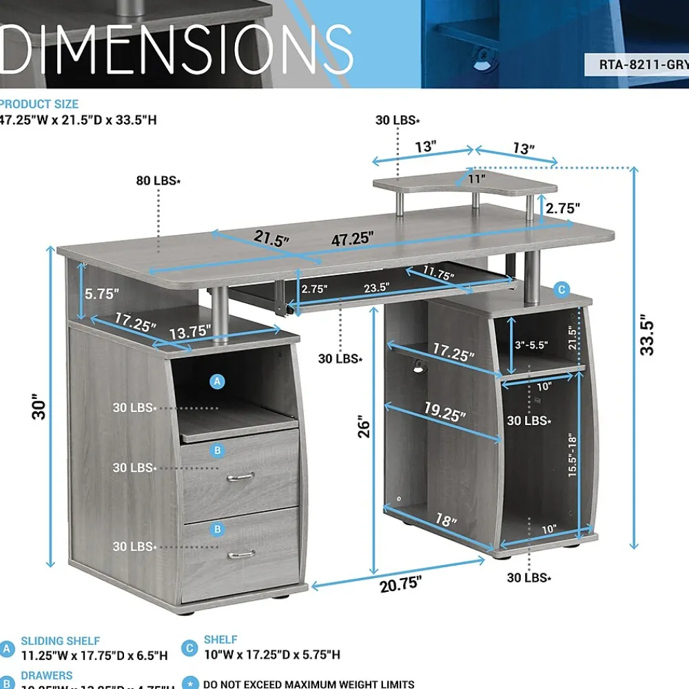 The Techni Mobili Dual Complete Computer Workstation Desk includes an elevated accessory shelf, slide-out keyboard and accessory shelves—both equipped with safety stops, 2 storage drawers, and an open CPU compartment with a shelf that can be moved up, down or completely removed. The elevated desktop provides additional storage above the pedestals. The slide-out accessory shelf and CPU compartment each have rear cable openings. The desktop has an 80 lbs. weight capacity, while the shelves can each hold up to 30 lbs., and the drawers each have a 22 lbs. weight capacity. This amazing multifunctional desk is made with MDF panels in Gray color, with a moisture laminate veneer. It’s stylish frames are made of scratch-resistant powder-coated steel, adding elegance to it’s fine design. Color: Gray