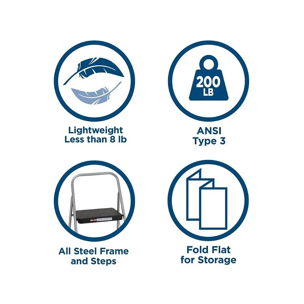 Slip resistant feet give additional security on any floor surface you’re working on, while avoiding any damage to your floor. The large steel steps provide extra security while in use, in addition to the locking top step. The Max Reach is 7 feet and 11 inches. (*Max Reach assumes a 5 ft 6 inch person with a vertical 12 inch reach) Weight capacity is 200 pounds meeting ANSI Type 3 standard.