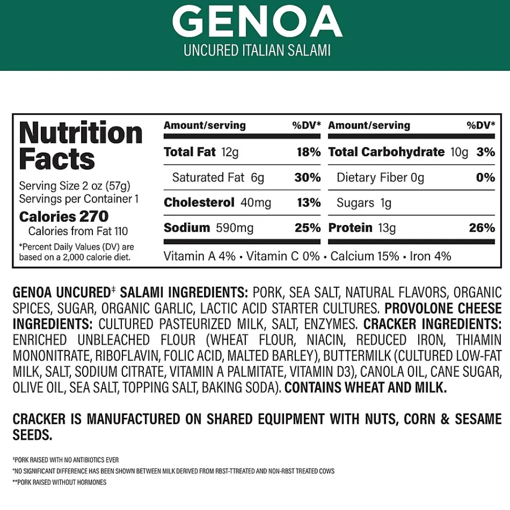 Uncured Italian salami made with organic garlic, salt & pepper paired with with soft Provolone and sea salt & olive oil crackers.