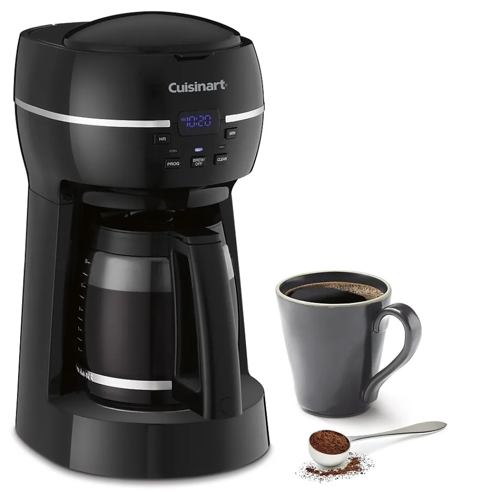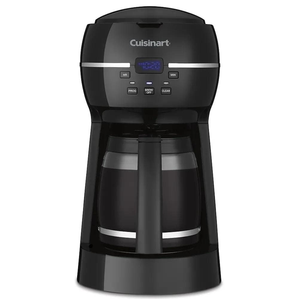 Savor delicious brewed coffee in style with the new 12 Cup Programmable Coffeemaker. With its modern curved design, this kitchen essential brings “fresh” to your cup and to your counter. Enjoy the convenience of preprogramming with 24-hour advance presets that accommodate any schedule, so a full carafe is ready to pour without any wait time. Make up to 12 cups in the ergonomic, easy-to-hold carafe that sits on a warming plate that keeps coffee hot for 2 hours, with an automatic shutoff setting. Set the clock, brew, run the cleaning process or sneak a quick cup in the middle of a brew cycle with the Brew Pause feature. The most delicious hot coffee is fast and fresh when filtered through both an easy-clean, permanent nylon coffee filter and a charcoal water filter. Freshen up your kitchen with the new 12 Cup Coffeemaker from Cuisinart.