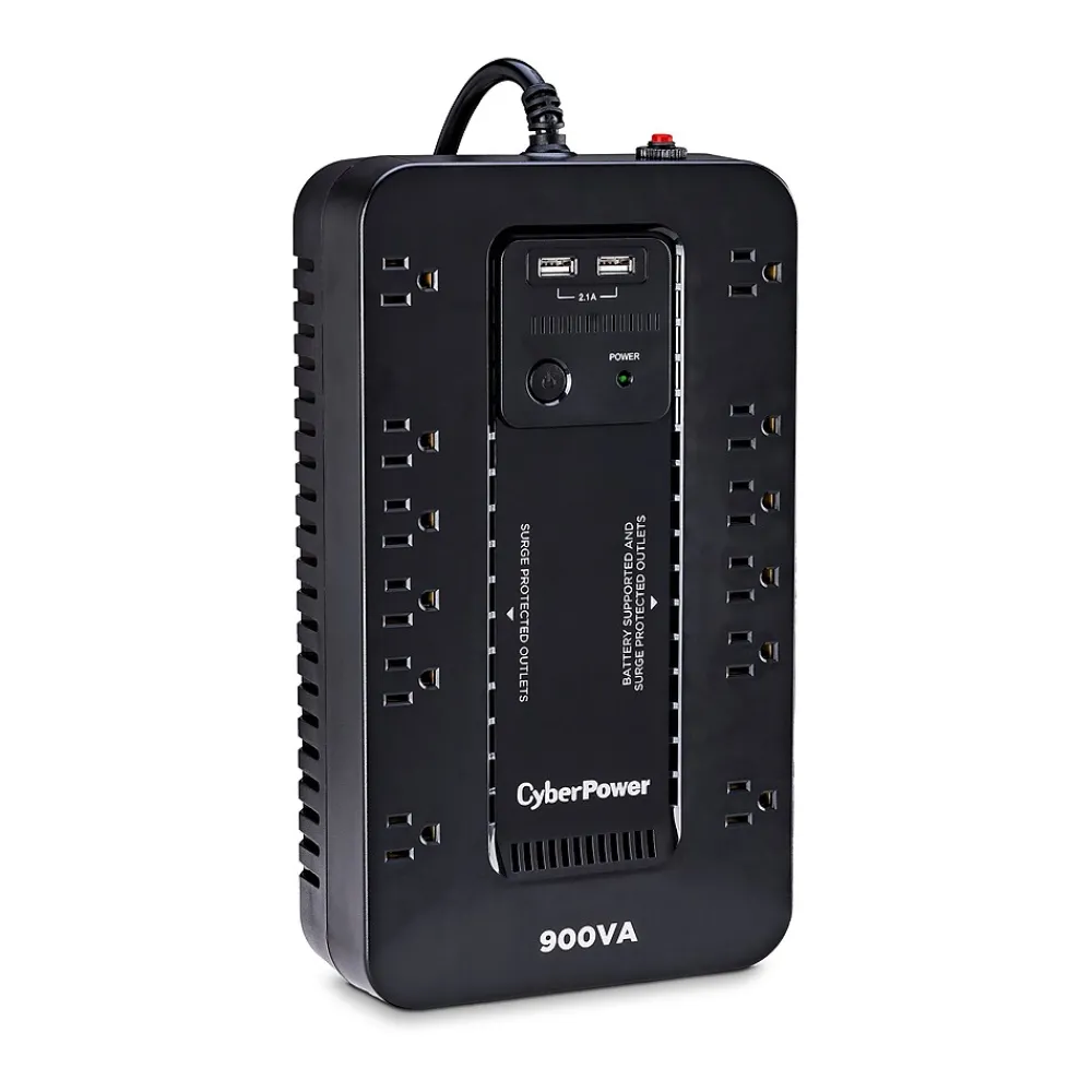 The CyberPower ST900U uninterruptible power supply (UPS) system provides battery backup and surge protection for lightning-induced surges and other power events that can damage electronic equipment. This unit delivers enough battery backup to power connected electronics through utility power failure and enough runtime to perform a graceful shutdown to protect against the loss of data and damage to valuable electronics during longer outages. The ST900U has two USB charging ports with 2.1 amp shared total output which gives you a faster charging time. This unit is designed to minimize noise for a quieter work environment and to run efficiently to reduce power consumption. Including a sleek design, this UPS is perfect for all your home office and entertainment needs, including computers, gaming consoles, and broadband routers.