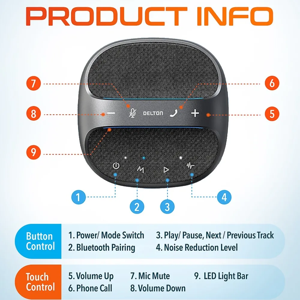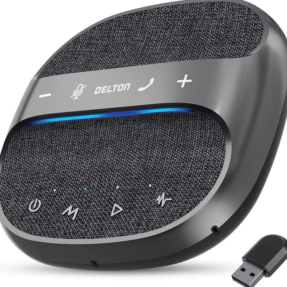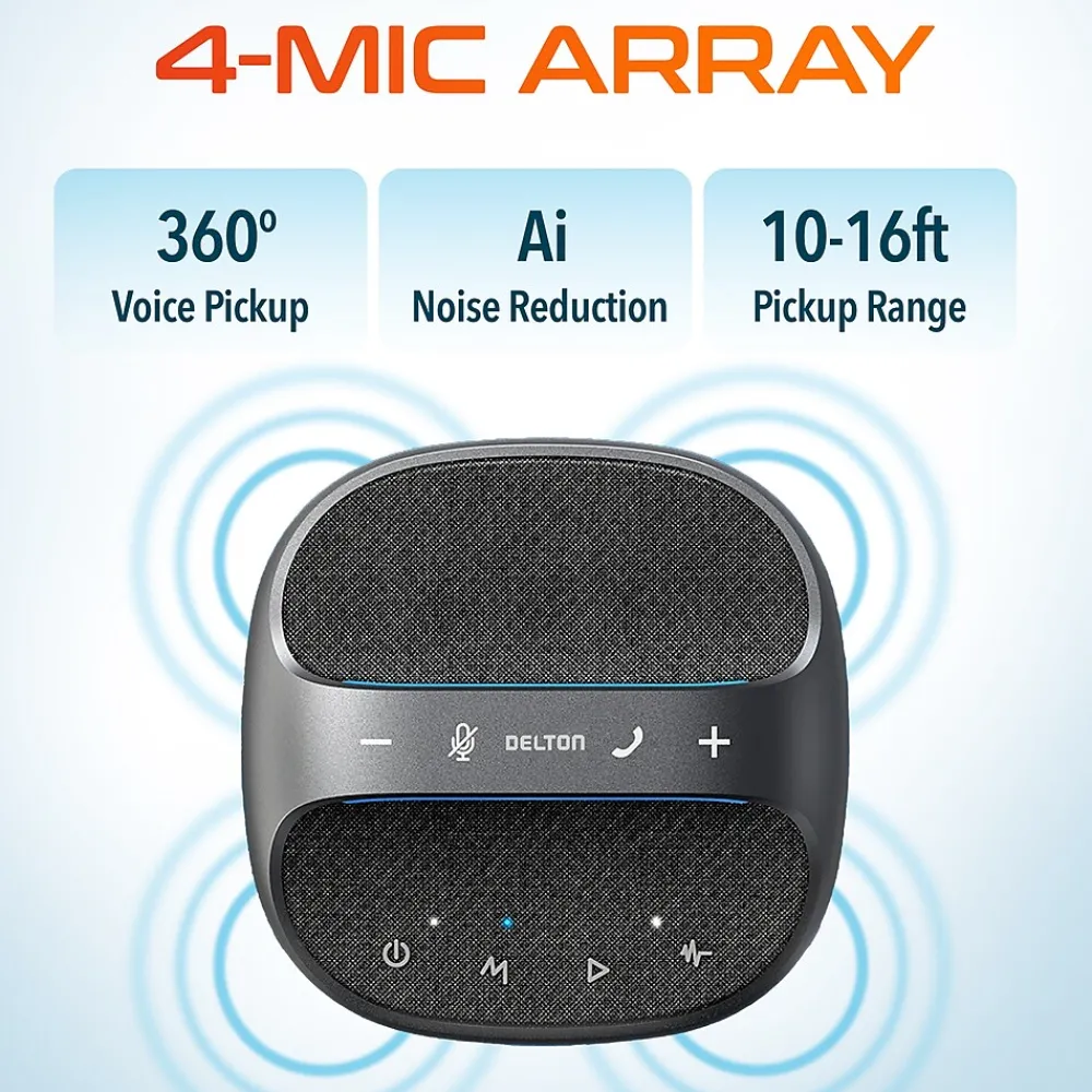 Elevate your conference calls with the Delton C4700 Bluetooth conference call speakerphone, designed for flawless integration across all major operating systems and communication platforms. This wireless conference speakerphone excels in delivering crystal clear audio for professional and personal use. With its easy-to-use touch and button controls and an auto-pair USB dongle, setting up is quick and hassle-free. The USB speakerphone boasts a remarkable 10-16′ microphone pickup range, making it perfect for large conference rooms. A one-click mute button, 360-degree voice pickup, and multiple connectivity options including Bluetooth, USB dongle, or USB Type-C cable ensure seamless communication. This speakerphone is designed for endurance with up to 9 hours of call time and supports two-way charging, offering flexibility for extended meetings. The built-in real-time noise reduction AI and Acoustic Echo Cancellation (AEC) enhance call quality, making every conversation clear and interruption-free.