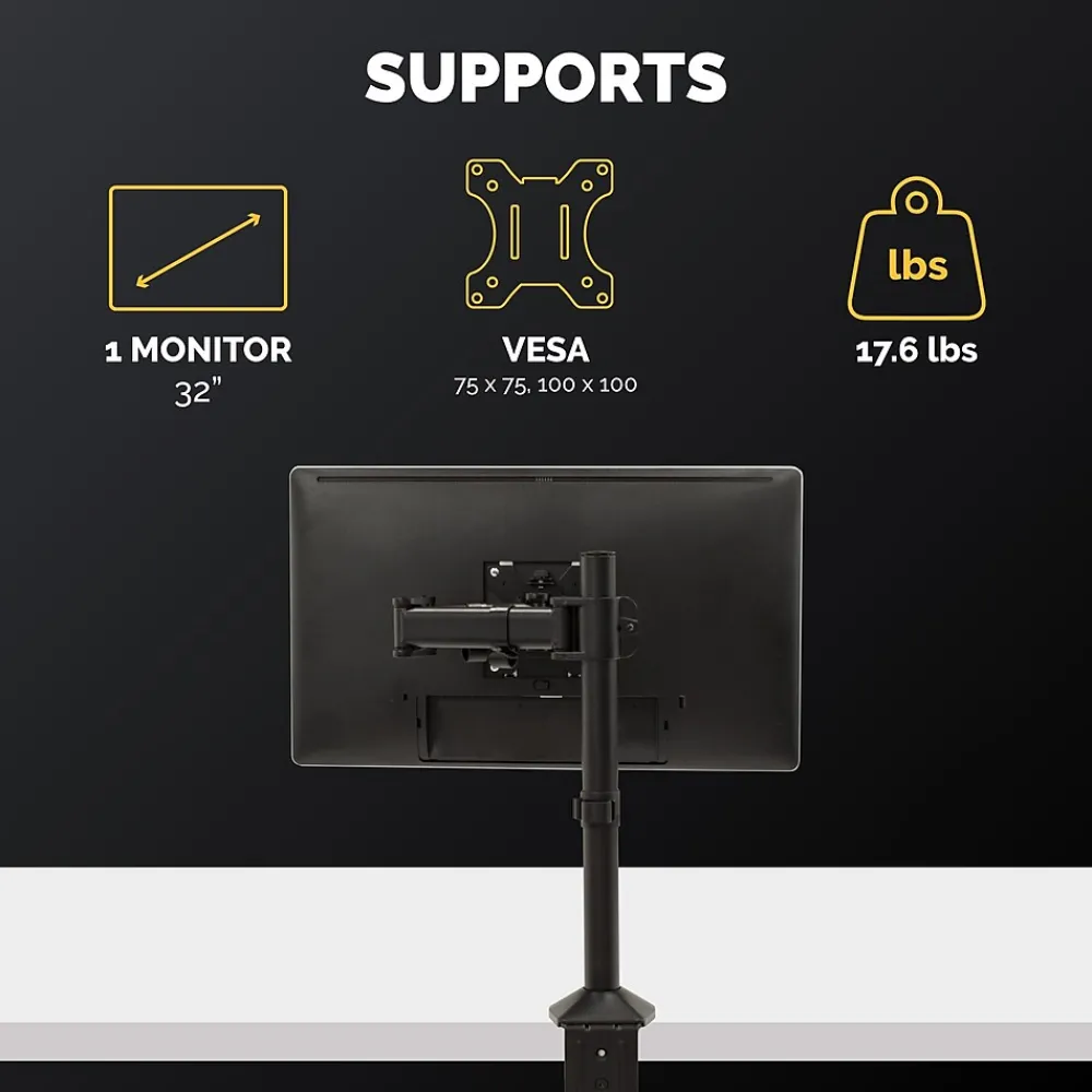 - SUPPORTS: Single monitor up to 32″ and 17.6 lbs., optimizing desk space with ergonomic design ideal for home or office