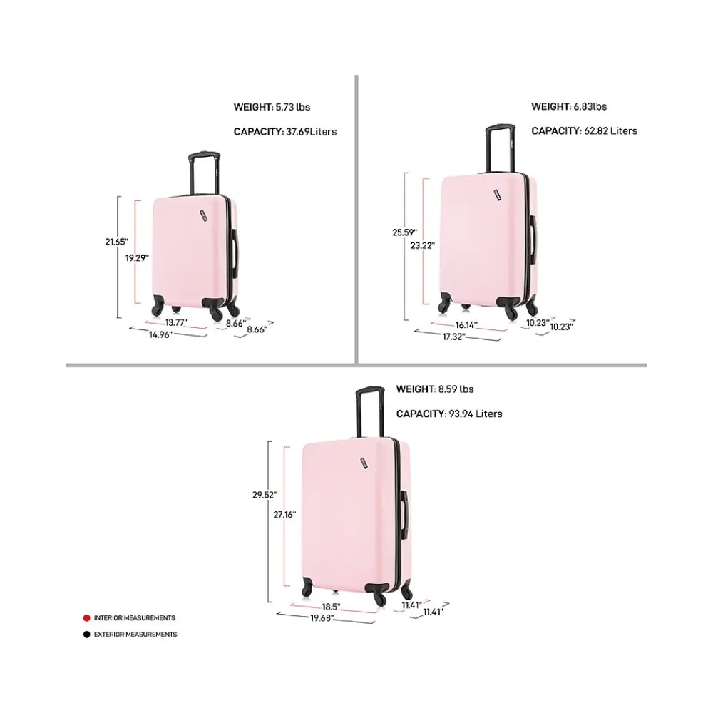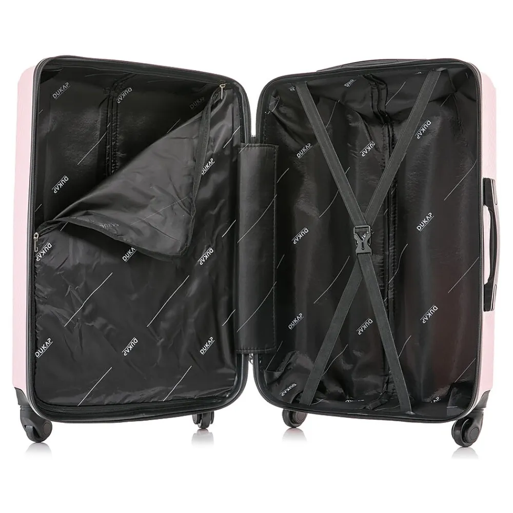 The DUKAP DISCOVERY hardside three-piece luggage set includes 20”/24”/28” suitcases with four dual-wheel spinner wheels, a full interior lining, ergonomic gel handles, side studs for stability, a retractable trolley system, and oversize zippers.