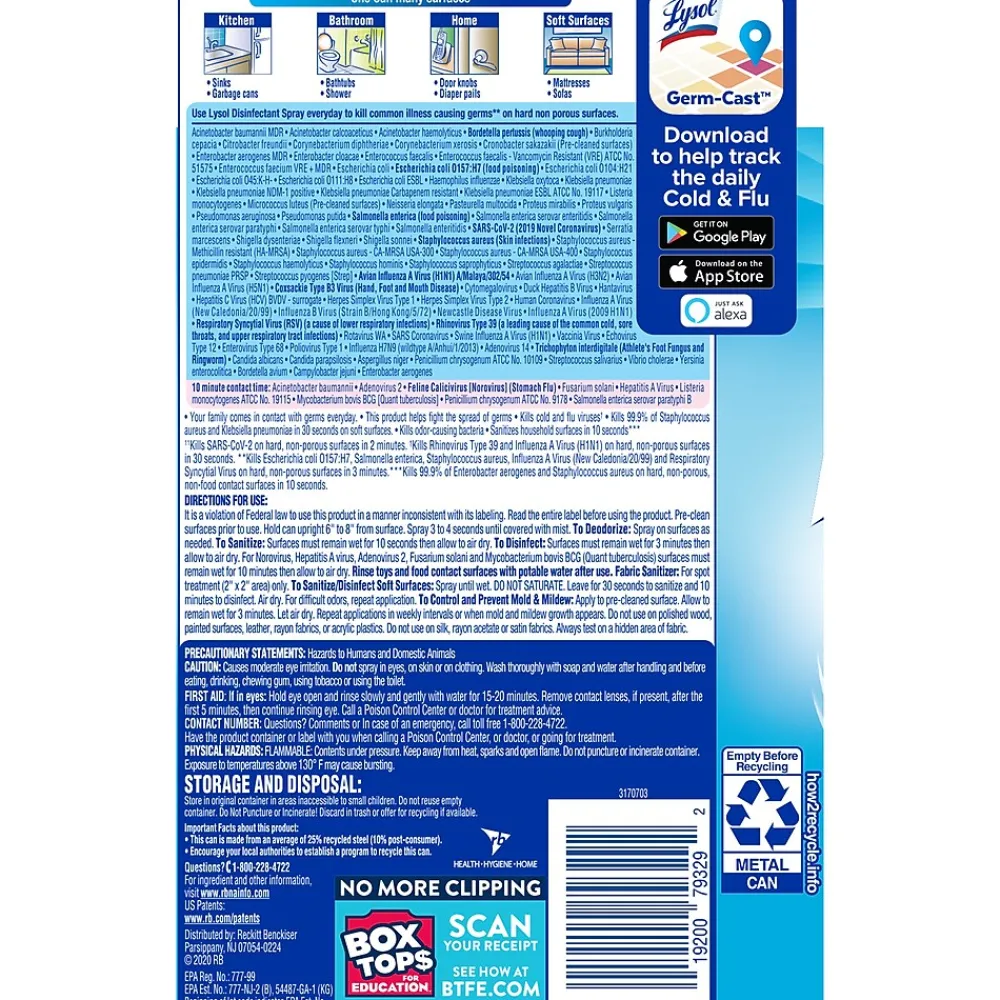 Lysol kills 99.9% of viruses and bacteria, including the virus that causes COVID-19 and cold and flu viruses when used as directed. Help protect high-traffic areas and high-touch surfaces, including desks, bathrooms, doorknobs, and railings. Deliver hospital-type disinfection on to soft surfaces, including upholstery, curtains, sofas, mattresses, and cushions. Meet customer and staff expectations around disinfection. Simply spray and let air dry.