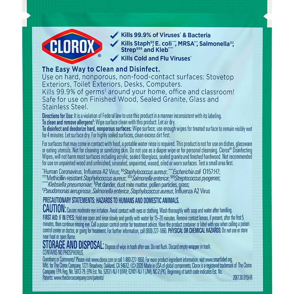 Clorox® Disinfecting Wipes1 To Go clean, disinfect and remove allergens* for 5x cleaning power* and leave a clean fresh scent. Take disinfecting on the go — in your car, purse, gym bag, carry-on or desk drawer —with these Clorox® wipes that kill 99.9% of viruses* and bacteria, including COVID-19 virus*, staph, E. coli, MRSA, salmonella, strep and Kleb. These travel packs of disposable wipes remove common allergens*, clean messes and kill germs* on surfaces like shopping carts, airplane tray tables , public bathroom surfaces, cell phones, gym equipment and more. They can even prevent the growth of odor-causing bacteria* for up to 24 hours. These bleach-free wipes are safe to use on finished wood, sealed granite and stainless steel. Disinfecting Wipes are also great on non-food-contact surfaces in the home, office, classroom, pet area, dorm and locker room. *Removes tough stains, cuts through grease, deodorizes, removes allergens (including pet dander, dust mite matter, pollen particles and grass) and removes soap scum. Kills SARS-CoV-2 on hard, nonporous surfaces. Kills human Coronavirus, Influenza A2 Virus, Pseudomonas aeruginosa, Salmonella enterica Staphylococcus Aureus. Kills odor-causing bacteria on non-food contact surfaces. Allow product to air dry. Use as directed.