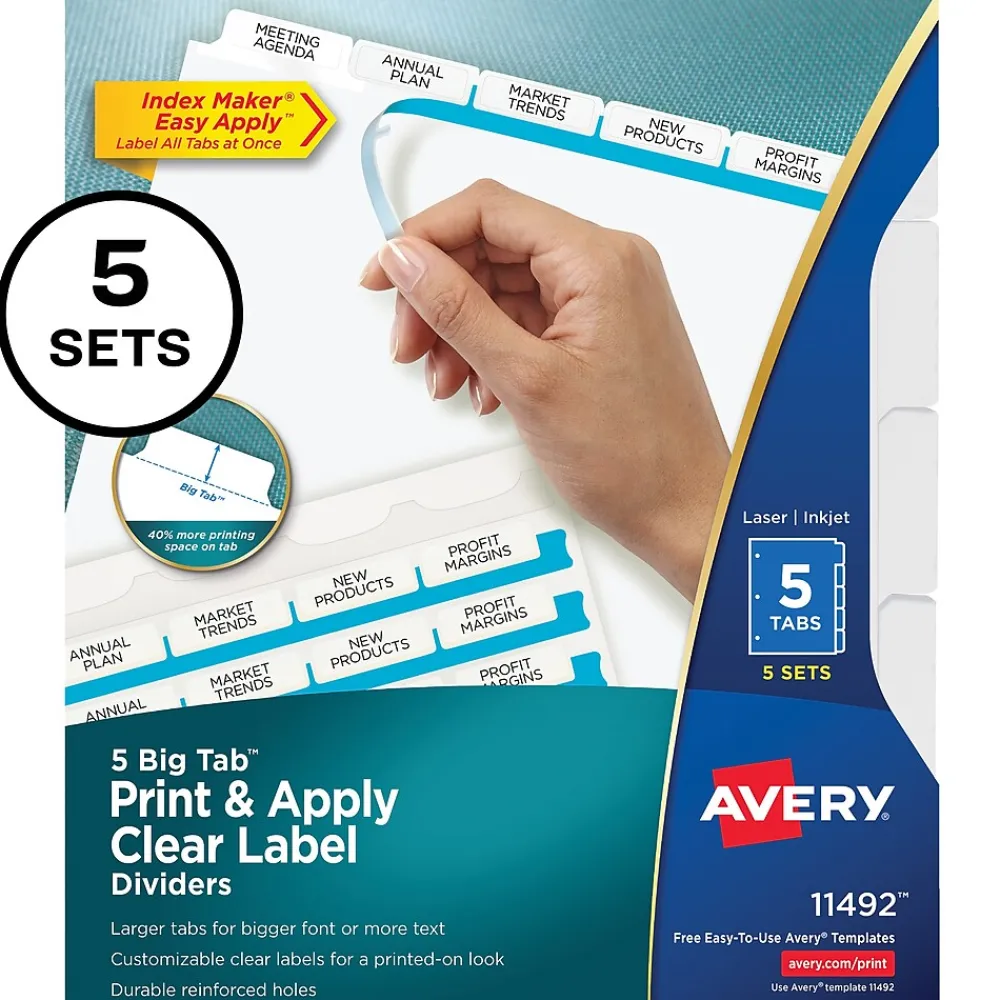 Don’t waste time and money ordering custom printed binder dividers with tabs when you can easily create and print your own personalized dividers with Avery Index Maker Clear Label Big Tab Dividers. Our larger Big Tab design offers more room for bigger fonts, more text and even logos or images. Customize your title tabs quickly and easily using the free templates on the Avery website and print with your inkjet or laser printer for clean, professional looking results in minutes. This pack comes with 5 sets of 5-tab dividers, and the Easy Apply clear label strips make it simple to apply all 5 labels of each set at once. Just print, align labels against tabs, smooth down labels and peel up strip. Each 3-hole punched durable divider also features doubled-sided, reinforced tabs and edges to help resist tearing for long-lasting, everyday use. These 3 ring binder dividers with tabs are a great addition to your medical office supplies, school binders, personal organizers, tax office supplies, presentation reports and more. Print, peel, and press your way to a perfect, precise project.