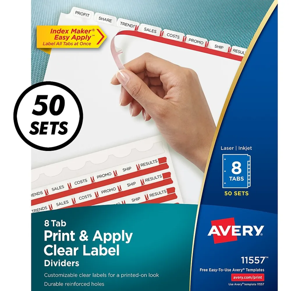 Easily create print shop quality personalized binder dividers with tabs using Avery Index Maker Clear Label Dividers. Customize the title tabs for your dividers quickly and easily using the free templates on the Avery website and print with your inkjet or laser printer for clean, professional looking results in minutes. This pack comes with 50 sets of 8-tab dividers, and the Easy Apply clear label strips make it simple to apply all 8 labels of each set at once. Just print, align labels against tabs, smooth down labels and peel up strip. Each 3-hole punched durable divider also features doubled-sided, reinforced tabs and edges to help resist tearing for long-lasting, everyday use. These 3 ring binder dividers with tabs are a great addition to your medical office supplies, school binders, personal organizers, tax office supplies, presentation reports and more. Print, peel, and press your way to a perfect, precise project.