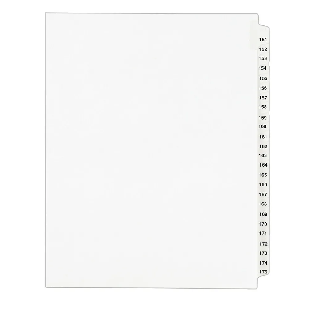 You have the right to organized and professional-looking files. This Standard Collated Legal Divider Set features Tabs 151-175 so it’s perfect for index briefs, legal exhibits, mortgage documentation files and more. White paper stock with clear, Rip Proof(TM) reinforced tabs are preprinted on both sides using Helvetica bold type for ease of use, and the unpunched binding edge gives you the freedom to fit practically any binding system. Here’s evidence these dividers will do your files justice.