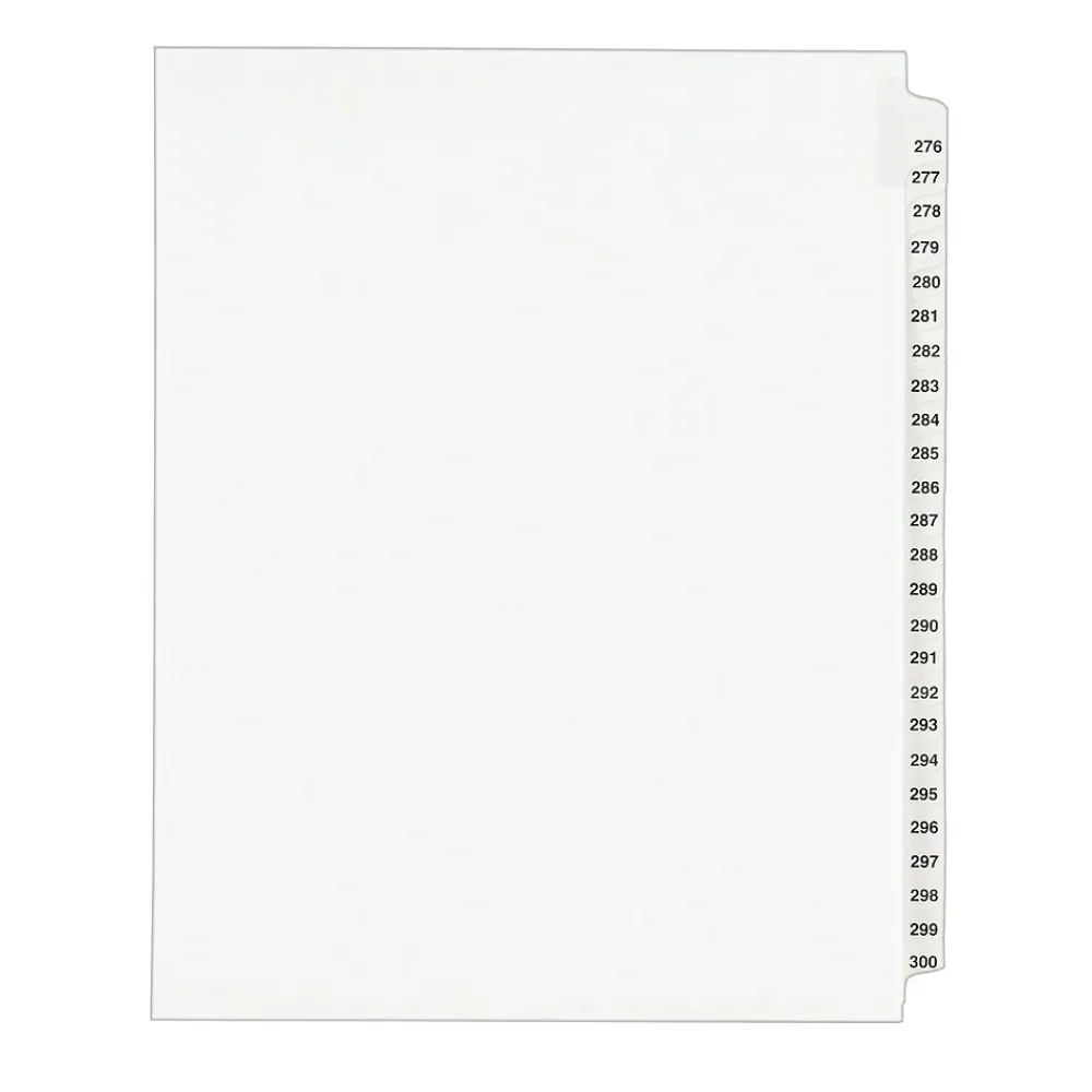 You have the right to organized and professional-looking files. This Standard Collated Legal Divider Set features Tabs 276-300 so it’s perfect for index briefs, legal exhibits, mortgage documentation files and more. White paper stock with clear, Rip Proof(TM) reinforced tabs are preprinted on both sides using Helvetica bold type for ease of use, and the unpunched binding edge gives you the freedom to fit practically any binding system. Here’s evidence these dividers will do your files justice.