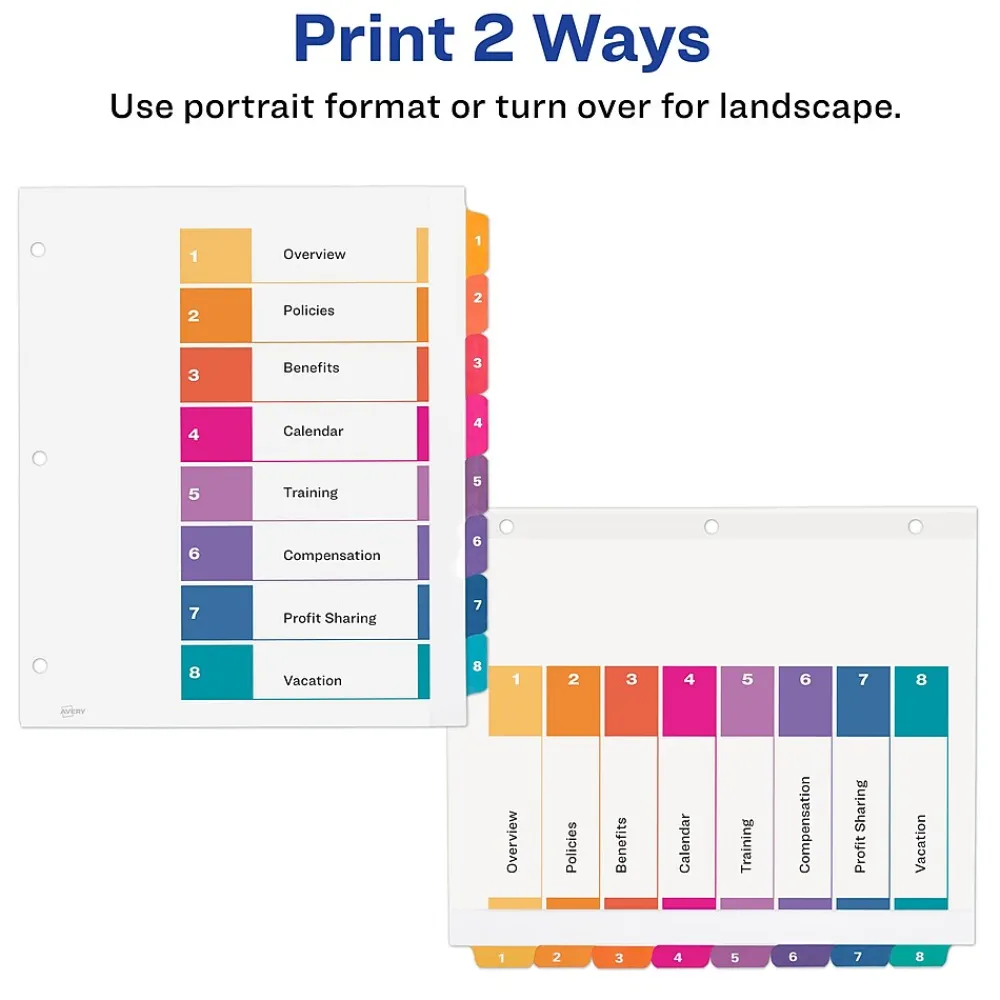 Give yourself a little extra space with Avery 11163 Extra-Wide Ready Index Dividers with customizable table of contents. The extra-wide dividers measure 9-1/4″ x 11″ so that your tabs won’t get hidden behind sheet protectors. Each pack includes a printable table of contents page that can be customized with free templates and designs by visiting the Avery site. Each side of the table of contents page features a different orientation so that you print in either portrait or landscape. Both the table of contents and the divider tabs are pre-printed and color-coded. Designed to be tear-resistant, the edges of each divider are laminated with a clear border on both sides to reinforce the pre-punched binder holes so that they can withstand repeated page flipping and use. 1 set of 8 dividers are included and 1 table of contents page. Whether you are a student organizing class notes, an office admin archiving files, a teacher keeping track of graded homework or a parent storing bills and other important documents, Avery dividers are the perfect way to organize your life in style.