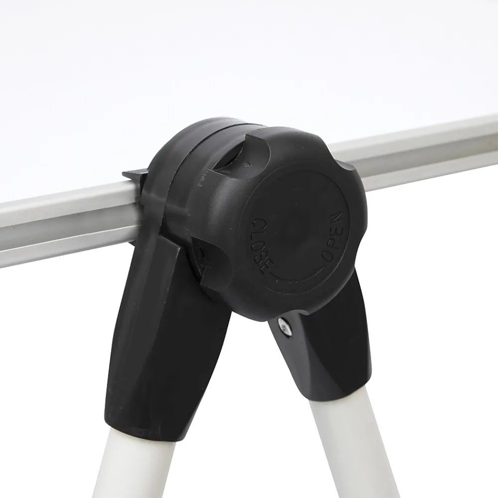This foldable magnetic dry erase board is versatile and accommodating. Whether in the classroom, office or home, it can be adjusted to whatever your needs may be. Double-sided magnetic dry erase board rotates a full 360 degrees. You can easily position the board into a landscape position to use as a temporary desk or use in a display position for meetings or front of the classroom. The height can also be adjusted from 40″ to 74″ to easily accommodate any viewing audience. Features a clamp and hooks for hanging presentation pads or flip charts. The sturdy aluminum frame with ABS corners protects edges of board. The anti-slip rubber feet will keep the board sturdy and stable when writing or erasing. Board also includes, four low odor chisel tip dry erase markers, four button style markers and a magnetic eraser to make this an all in one set! Foldable metal frame makes it easy to use and carry, no assembly required. Markers are AP Certified.