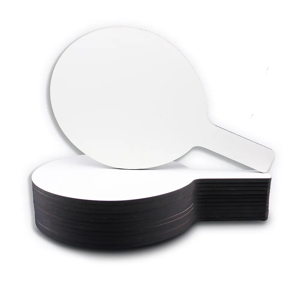 Quick and quiet whole class participation made easy with Dry Erase Answer Paddles. Great for review sessions, surveys, assessment and more! Non-ghosting dry erase surface with a rounded shape, an easy grip handle and smooth edges. Hardboard backing is warp and chip resistant. Each paddle measures 7″ wide x 12″ high x 0.25 deep”.Made in USA.