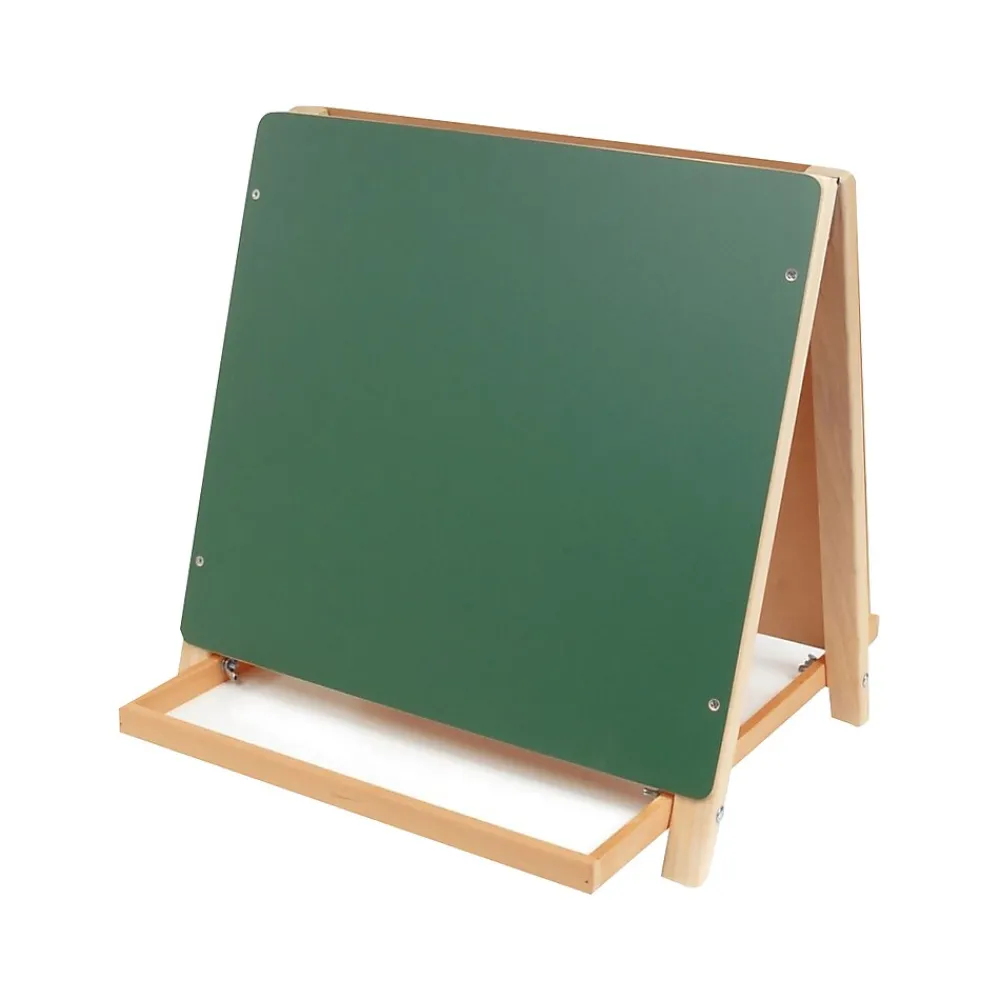 Designed for tabletop use, this easel features a white dry-erase surface on one side and a green chalkboard on the reverse. A large center tray provides useful storage space.