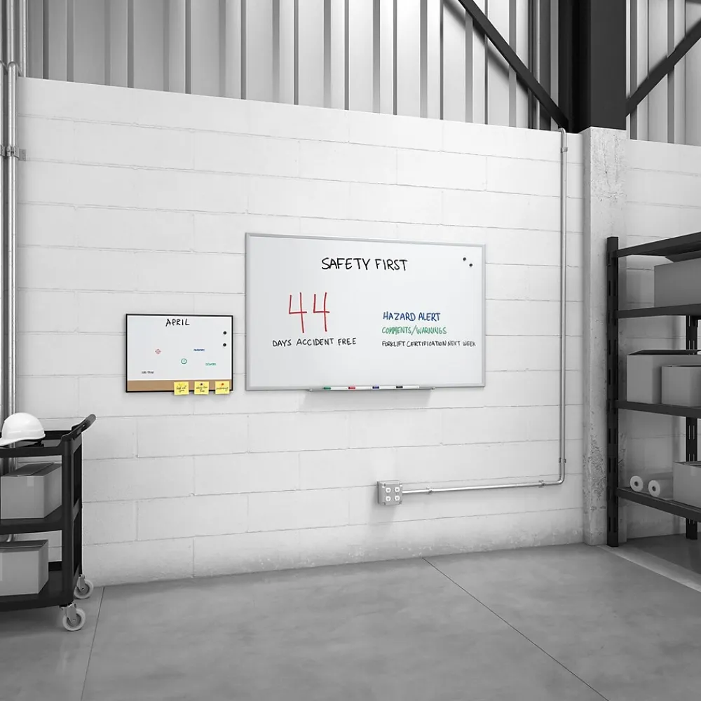 This TRU RED™ whiteboard features a durable, non-porous magnetic porcelain surface that prevents marker ink from penetrating the board and makes cleaning just as easy as writing. The magnetic surface of the board is perfect for brainstorming additions like papers, photos, or designs. The large surface area of the board is easy to care for, perfectly sized for use in the office or the home, with an added versatility that allows vertical or horizontal placement. Clean when necessary but know that those long-term ideas can stay up without worrying about leaving a permanent stain.