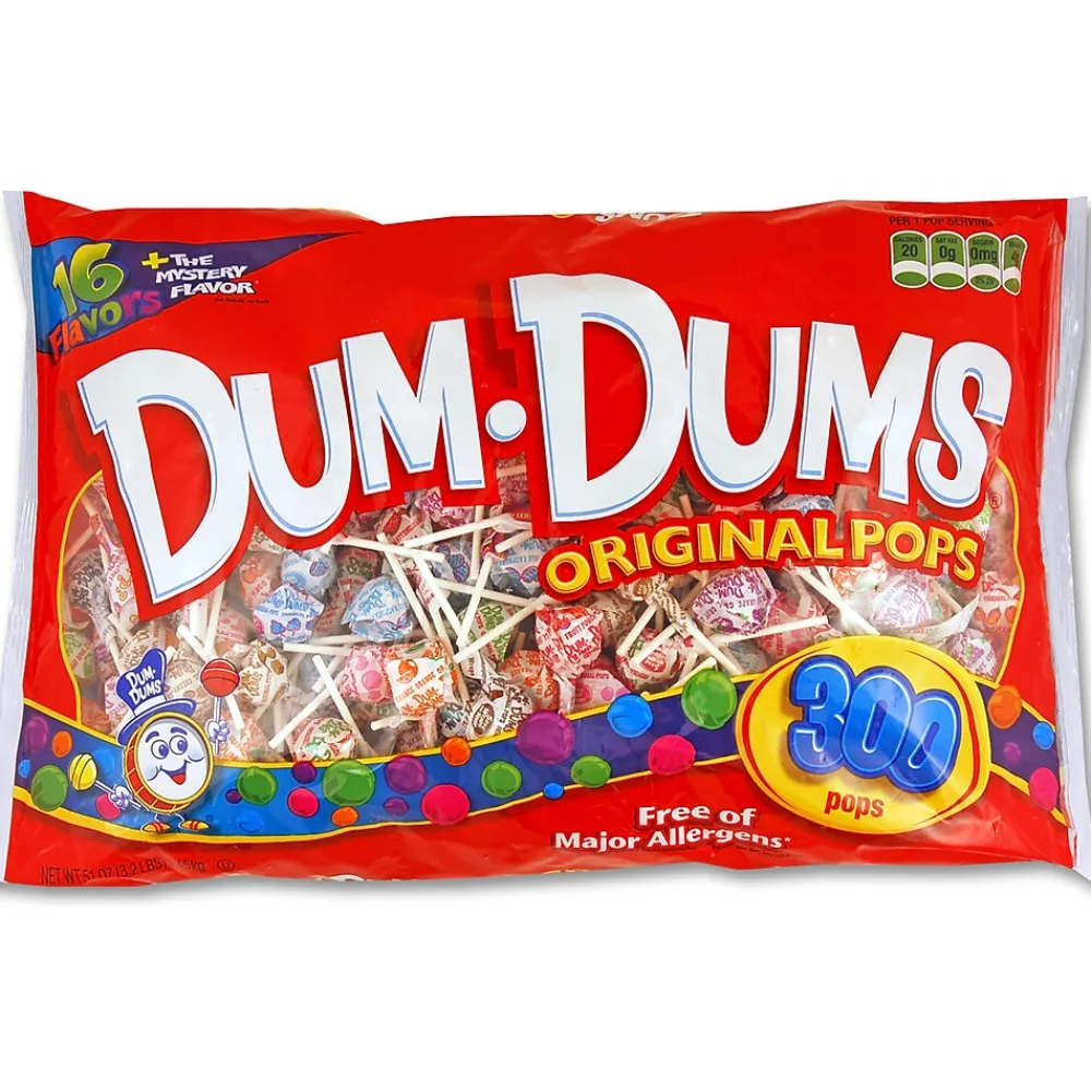 Bring smiles to many faces with this bag of flavorful suckers. Each bulk pack contains 300 lollipops with a mix of 16 familiar flavors and one mystery flavor. Dum-Dums lollipops are individually wrapped and free of common allergens, so people will feel comfortable helping themselves.