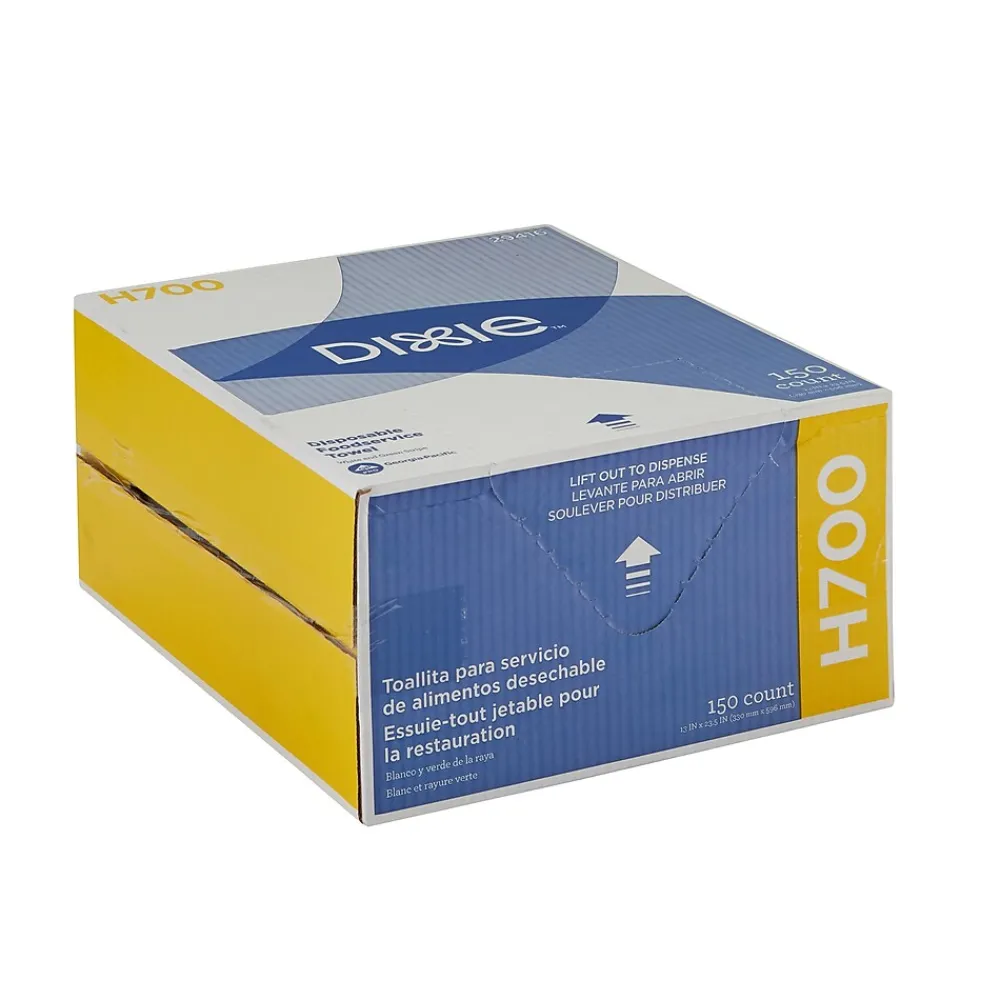 The Dixie strong, soft, thick and absorbent foodservice towel is engineered from super strong hydro entangled fibers that make it perfect for front or back of the house cleaning. These white with green stripe, medium duty towels deliver superior cloth-like cleaning to handle almost any job and are especially designed for fast, streak-free wiping on messy tabletops, grimy countertops, and even the greasiest stove tops. You name it-this wiper can handle it. Long-lasting, machine-washable towels come in a convenient dispenser box for added protection and quick, easy dispensing.