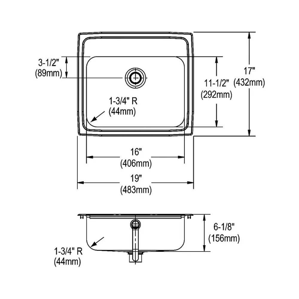 - Overall dimensions: 17″H x 19″W x 6.13″D; bowl dimensions: 11.5″H x 16″W x 6″D; drain opening measures 1.5″Dia.