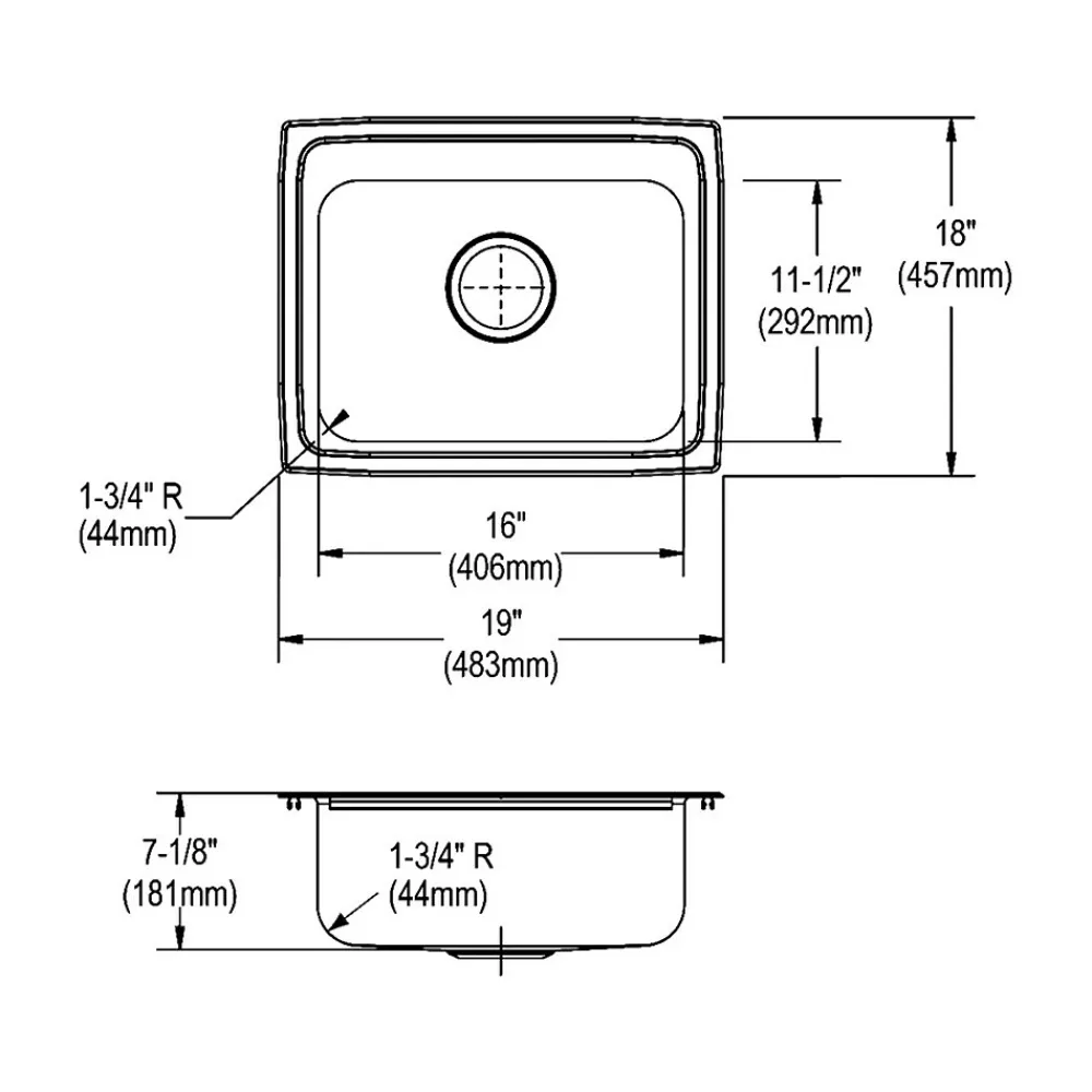 - Overall dimensions: 18″H x 19″W x 7.13″D; bowl dimensions: 11.5″H x 16″W x 7″D; drain opening measures 3.5″Dia.