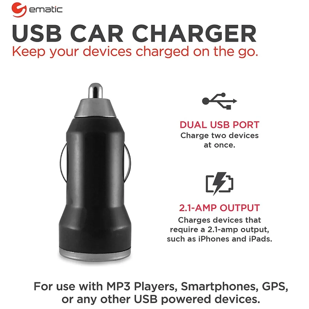 The Black Ematic 2.1 Amp 2-Port USB Car Charger lets you keep your USB-powered devices fully charged when you hit the road. This USB-A charger allows you to make sure that your favorite devices don’t run out of battery life when you’re away from home. Simply place it in your vehicle’s cigarette lighter or accessory port and let your device sit and power up as you drive. Use with MP3 players, smartphones, GPS, or any other USB-powered devices. The USB Car Charger is also a nice way to make sure you can listen to your favorite tunes, podcasts, and other audio in your vehicle. Reduce your downtime, stay productive, and have fun with the help of this device.